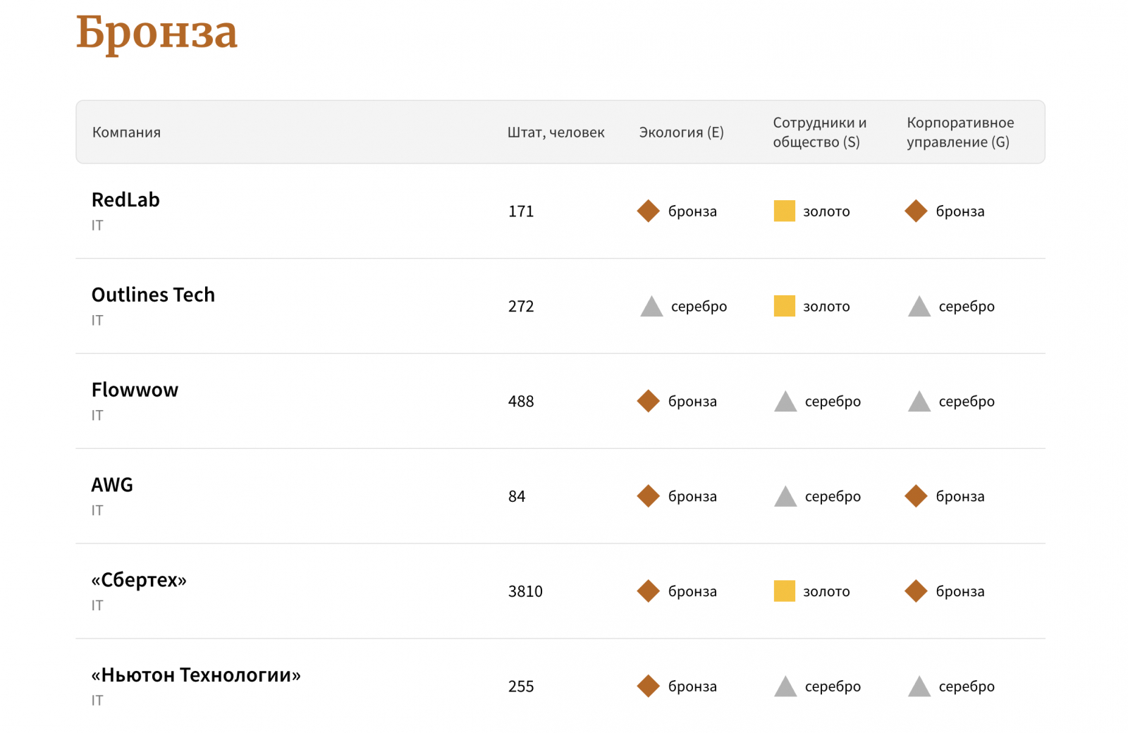 Экспертное жюри подготовило исследование на базе ESG-методики, которая учитывает три блока: «Экология» (E), «Сотрудники и общество» (S) и «Корпоративное управление (G)». В зависимости от набранных баллов участники рейтинга распределялись по четырем группам: «Платина», «Золото», «Серебро» и «Бронза».