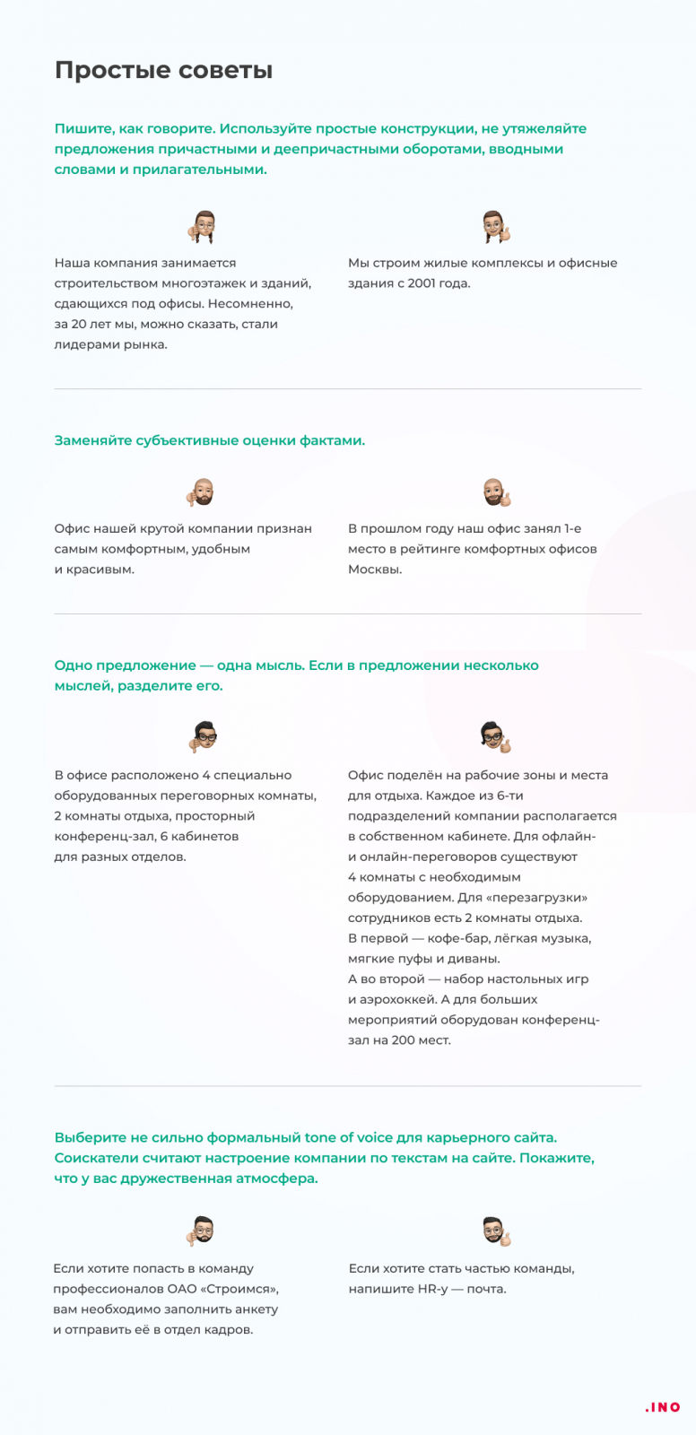 Карьерный сайт делается для людей, поэтому важно, чтобы тексты на страницах были понятными и лёгкими в чтении. Никто не хочет читать тяжёлый канцелярский язык, соискатели просто хотят познакомиться с компанией и отправить резюме.