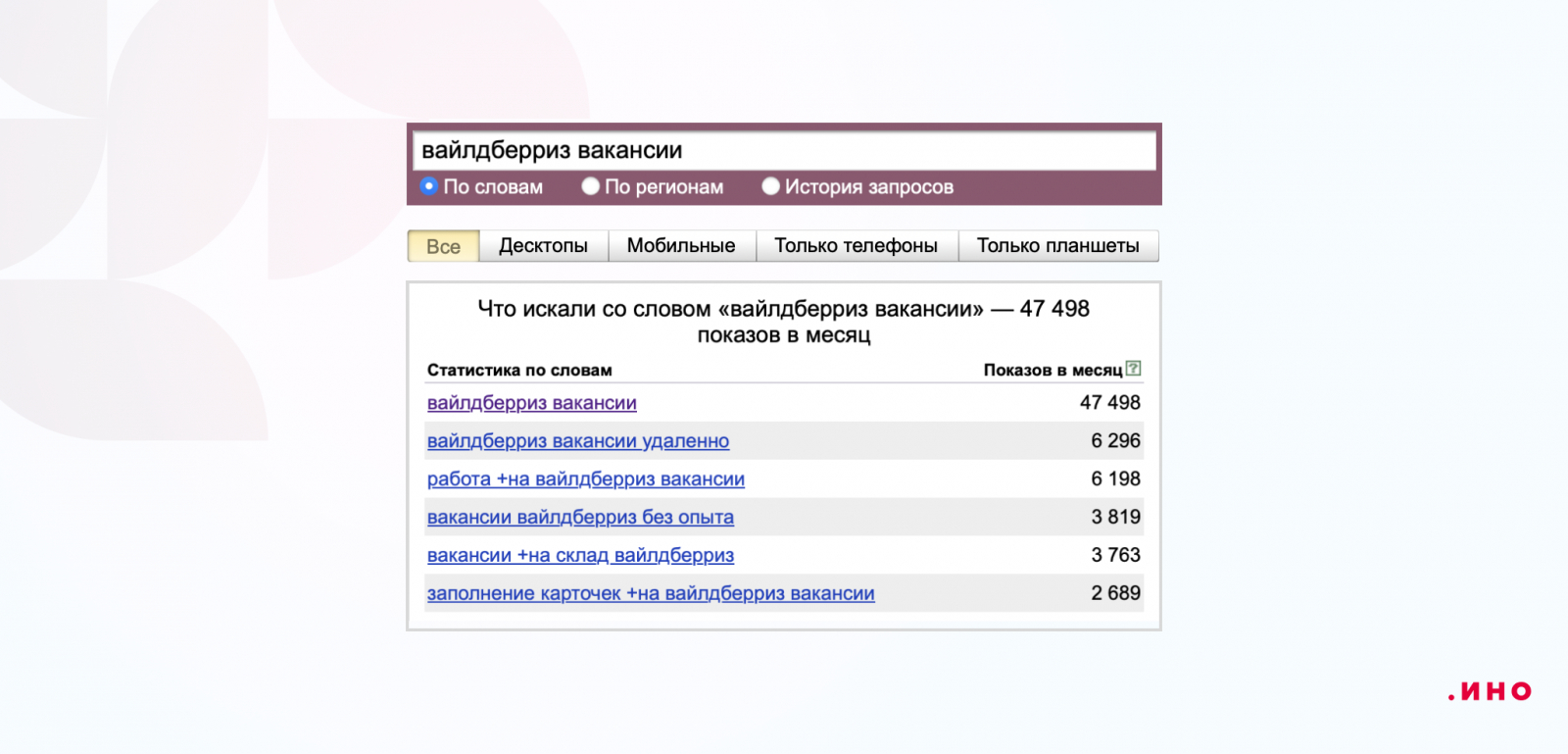 А запрос «Вайлдберриз вакансии» насчитывает 47 498 показов в месяц.