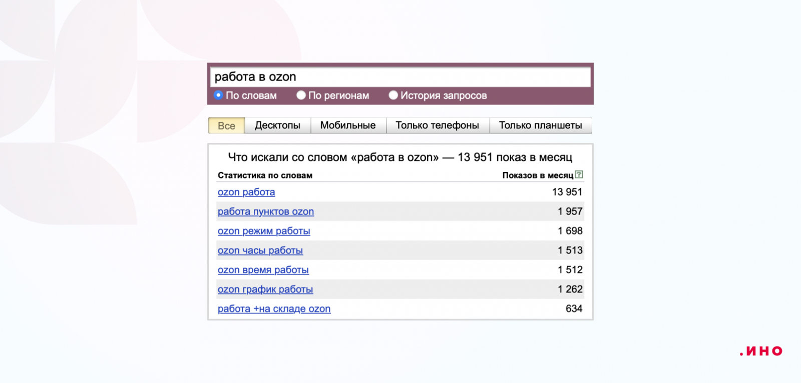 Теперь посмотрим, как обстоят дела у Ozon. Фраза «работа в Ozon» собрала 13 951 показ в месяц.