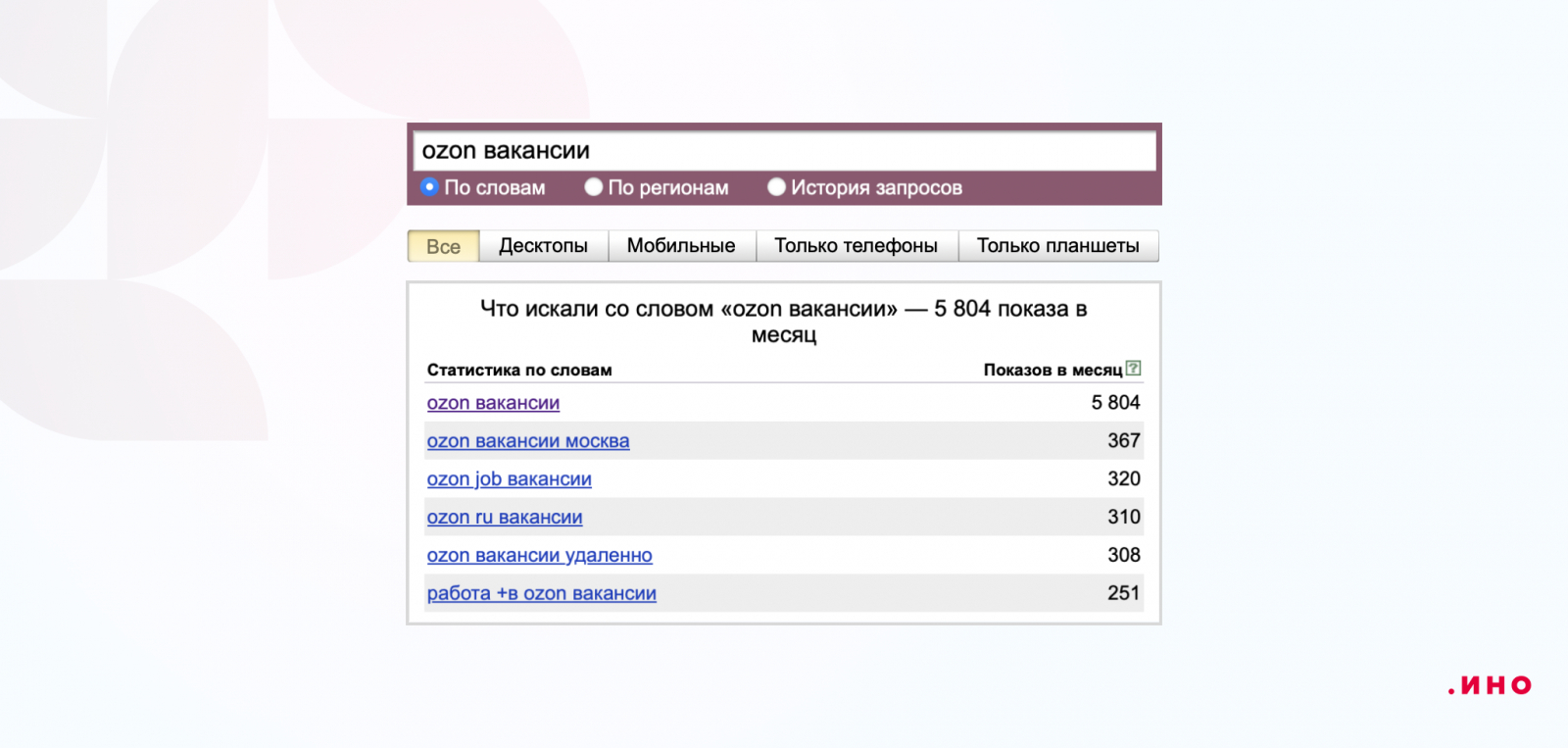 А запрос «Ozon вакансии» 5 804 раза показывался в выдаче Яндекса.
