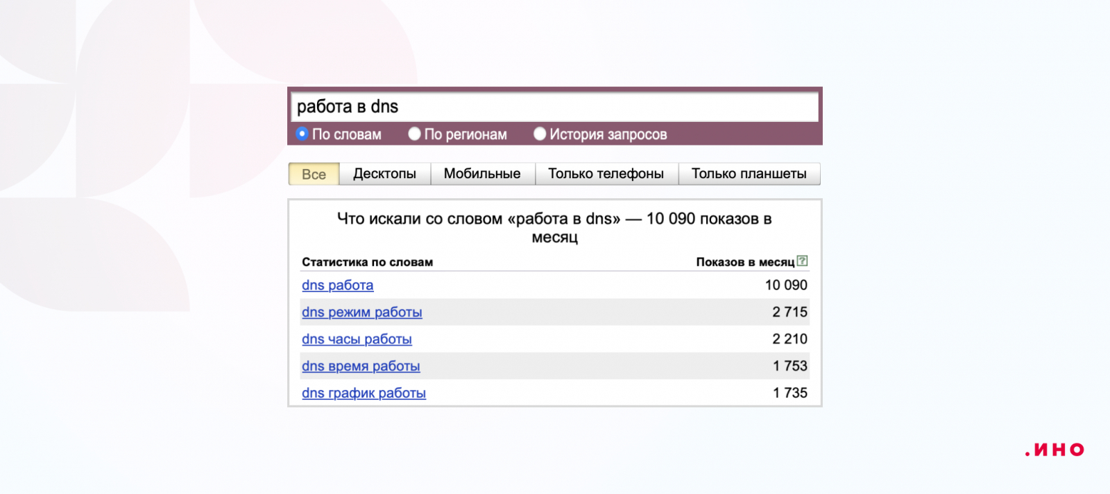 Теперь посмотрим, как ищут работу в DNS. Вводим фразу «работа в DNS» и получаем 10 090 показов в месяц.