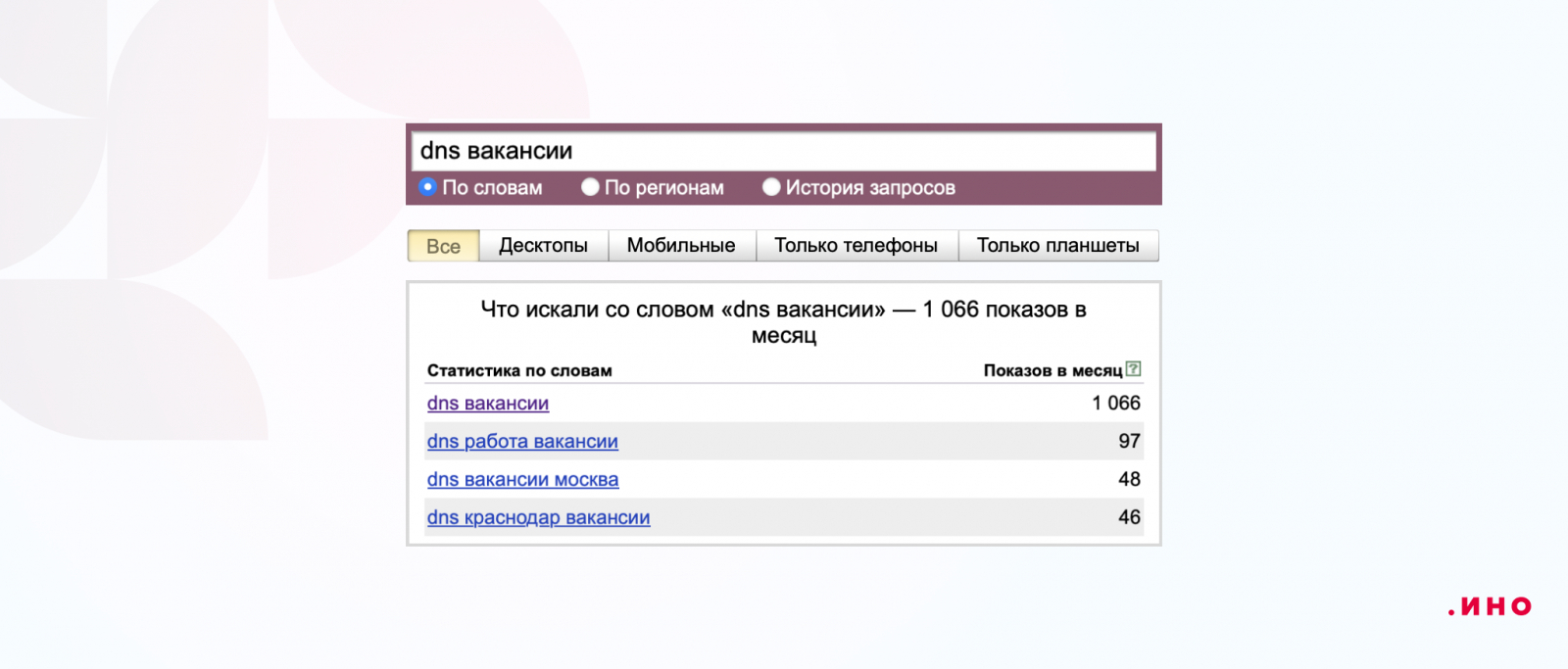 Фраза «DNS вакансии» собрала 1 066 показов в месяц.