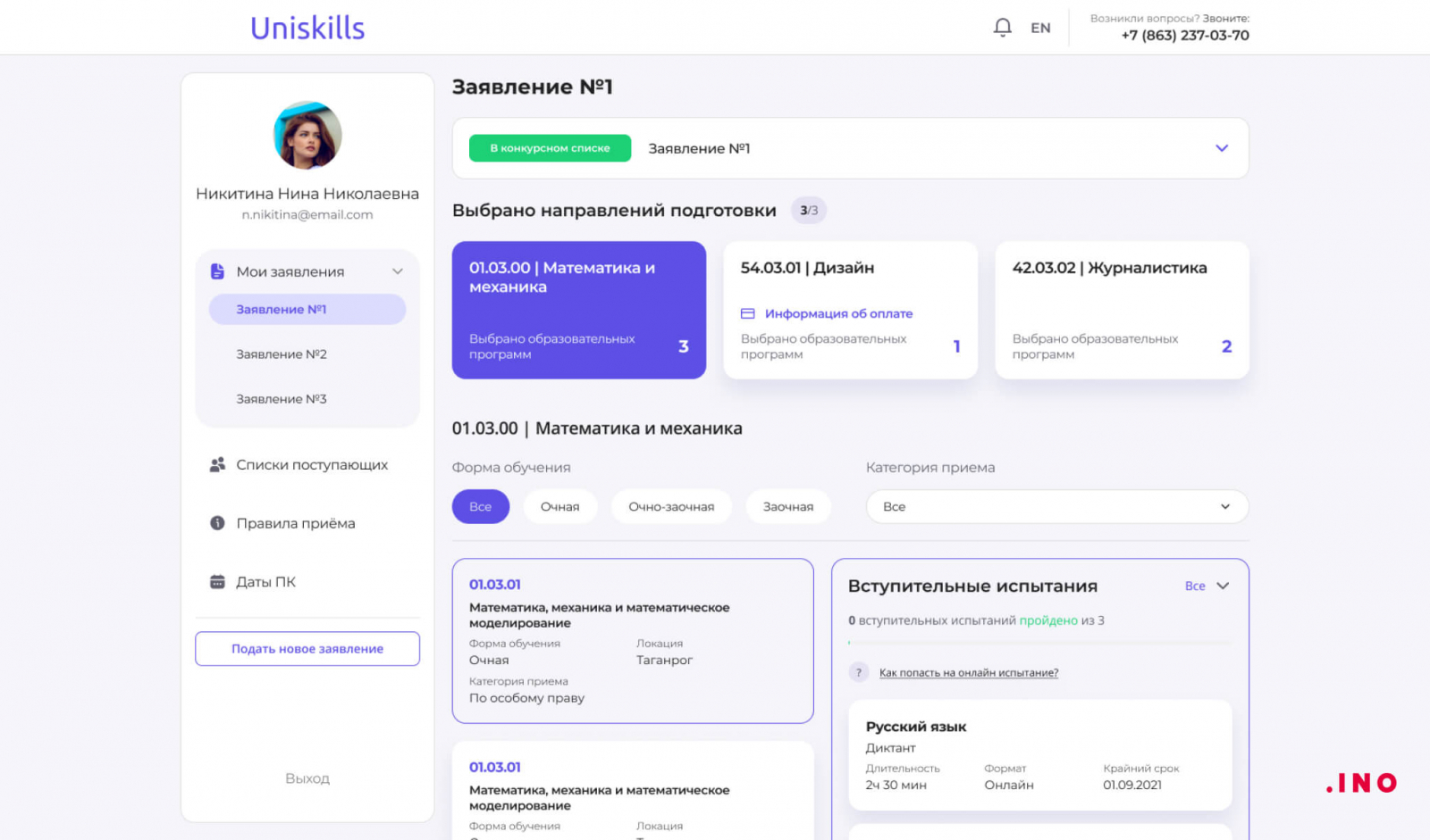 Платформа создавалась для того, чтобы абитуриенты могли подавать заявление в вуз онлайн без личного присутствия. Информация отображается в виде дашборда, который показывает всё необходимое — статус выбранных образовательных программ, информацию о вступительных испытаниях, список абитуриентов с их количеством баллов. Личный кабинет будет сопровождаться подсказками. Абитуриент сможет написать в чат-бот, если возникнет срочный вопрос.