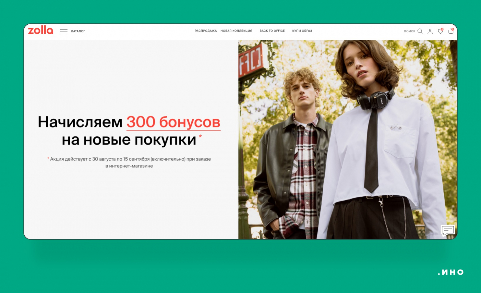 Главная страница магазина одежды сбалансирована по композиции. В каталоге и основном тексте используются схожие начертания одного шрифта, акцент в заголовке сделан тем же цветом, что и логотип, поэтому информация считывается и запоминается легко.