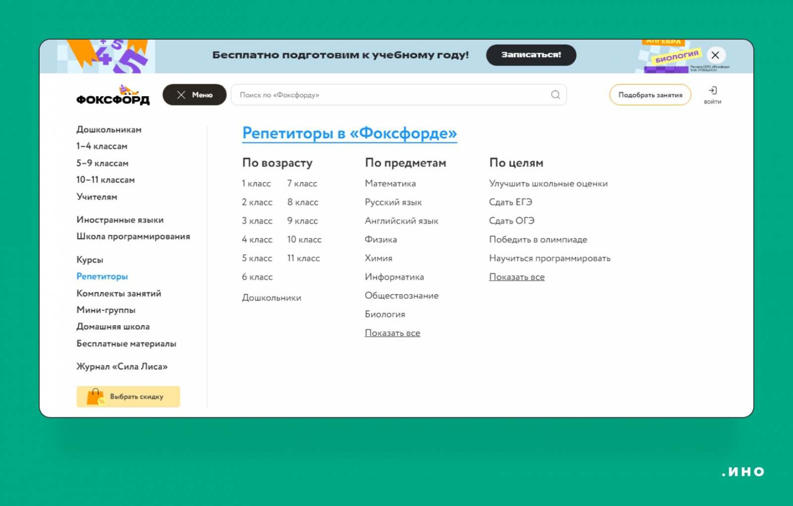 Помогут инструменты UX/UI-дизайна. Например, в онлайн-школе Фоксфорд учат десяткам предметов и дошкольников, и школьников, и учителей. Чтобы показать все услуги, используют «бургерное» и выпадающее меню. Когда информация удобно показана на одном экране, выше шансы, что родитель увидит подходящий предмет и запишет туда ребенка.