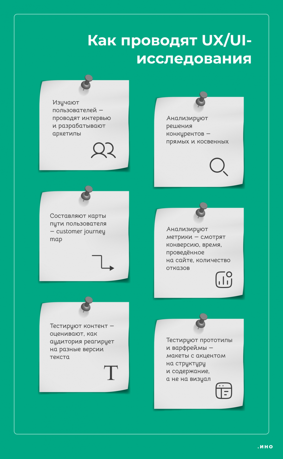 Выбирают тип исследования. Для одного продукта применяют несколько способов UX/UI-исследования, так как важно и изучить типы юзеров, и продумать сценарии использования, и подобрать наиболее понятные тексты.