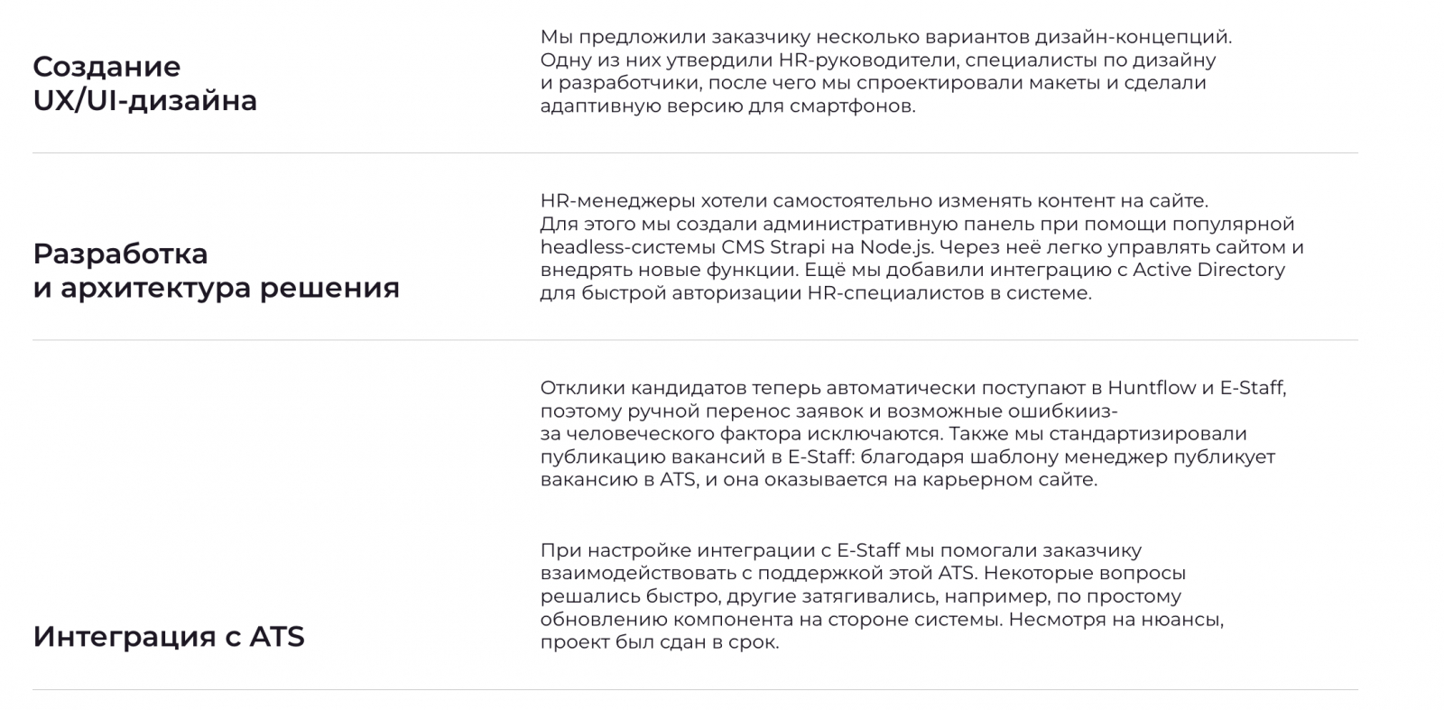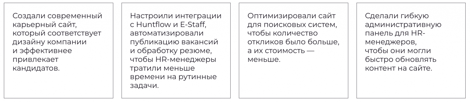 Для решения задач заказчика мы проанализировали текущую платформу, описали этапы работы в техническом задании и предложили способ автоматизации работы с сайтом. Утвердили план с клиентом и приступили к работе: отрисовали UX/UI-дизайн, разработали карьерный сайт, протестировали его и запустили SEO.