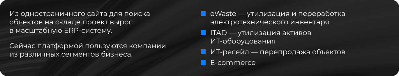 Наш клиент — предприниматель, управляющий сетью складов. Его бизнес занимается переработкой б/у техники: часть утилизируют, часть перепродают.