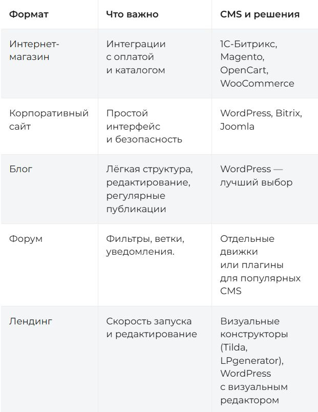 CMS подбирают, опираясь на задачи проекта и специфику бизнеса. Универсального решения не существует — для каждого сайта нужен свой подход.