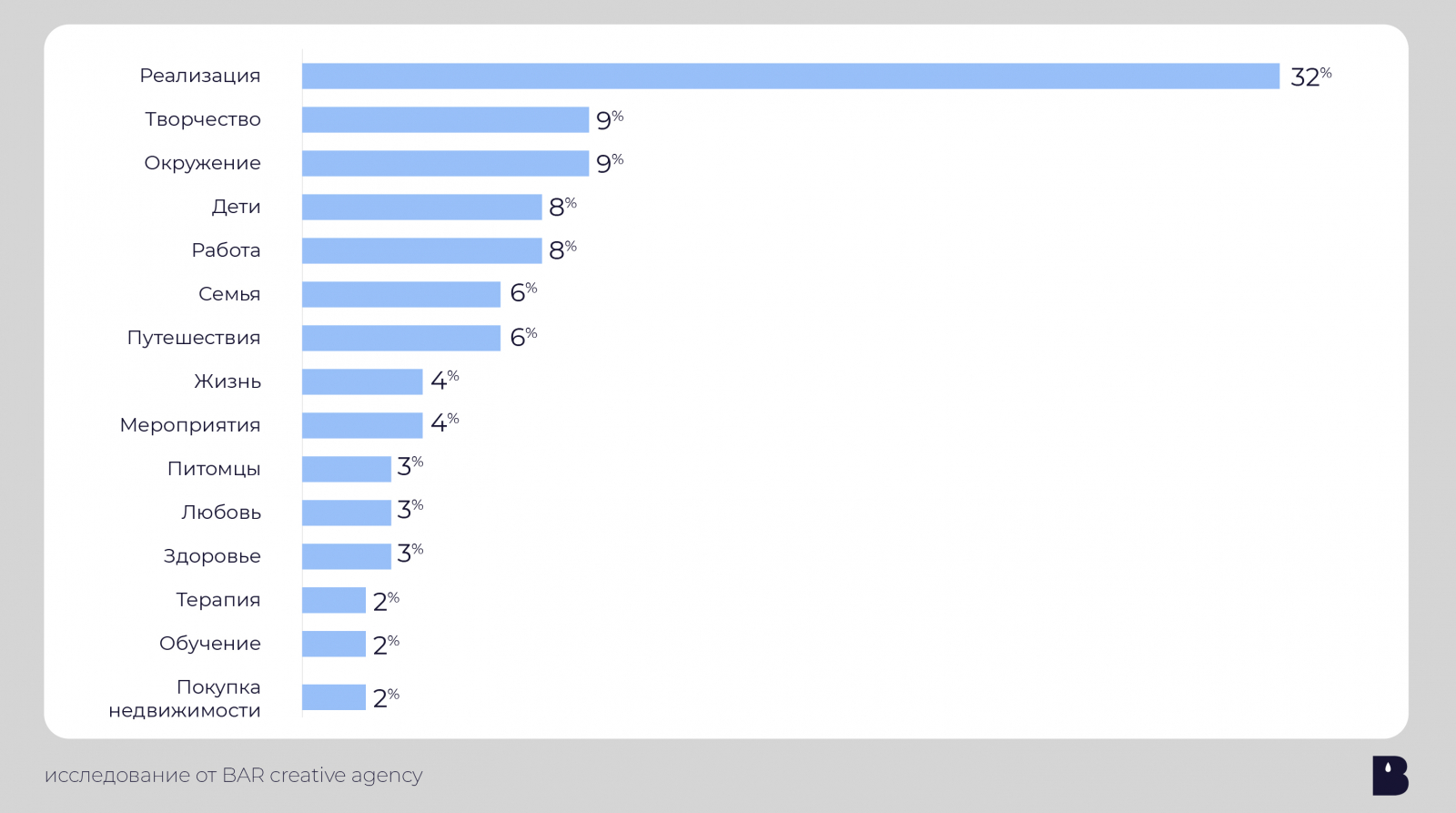 Творчество (15%), посещение различных мероприятий (11%), реализация (8%) и семья (7%) тоже приносят счастье аудитории этой соцсети.
