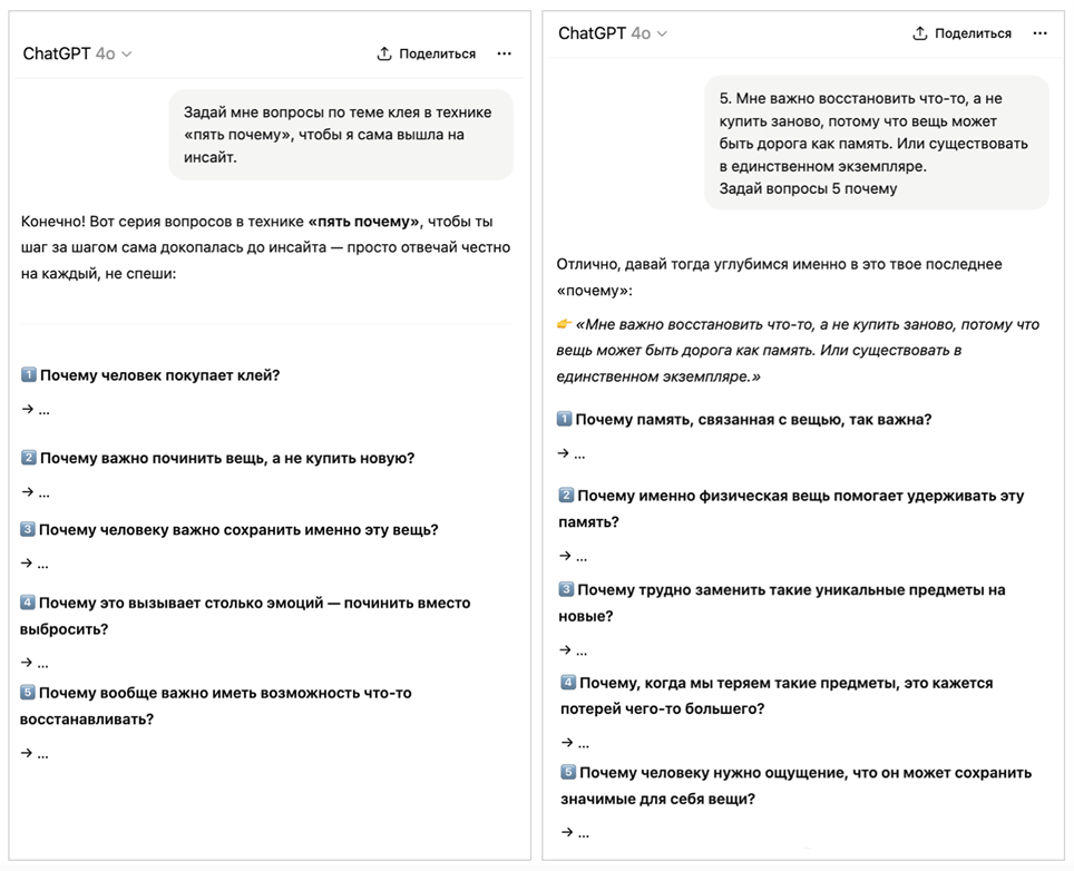 Да, со вторым промтом придётся поработать головой: нужно придумать сами темы вопросов. Например, про повседневные привычки, связанные с использованием продукта. Про то, как они шутят про клей. Про то, что их бесит в клее. Про то, в каких ситуациях он может спасать, а в каких – бесполезен. Вы удивитесь, как много всплывёт у вас в голове. Первый пул идей появится уже по ходу ответов на эти вопросы: