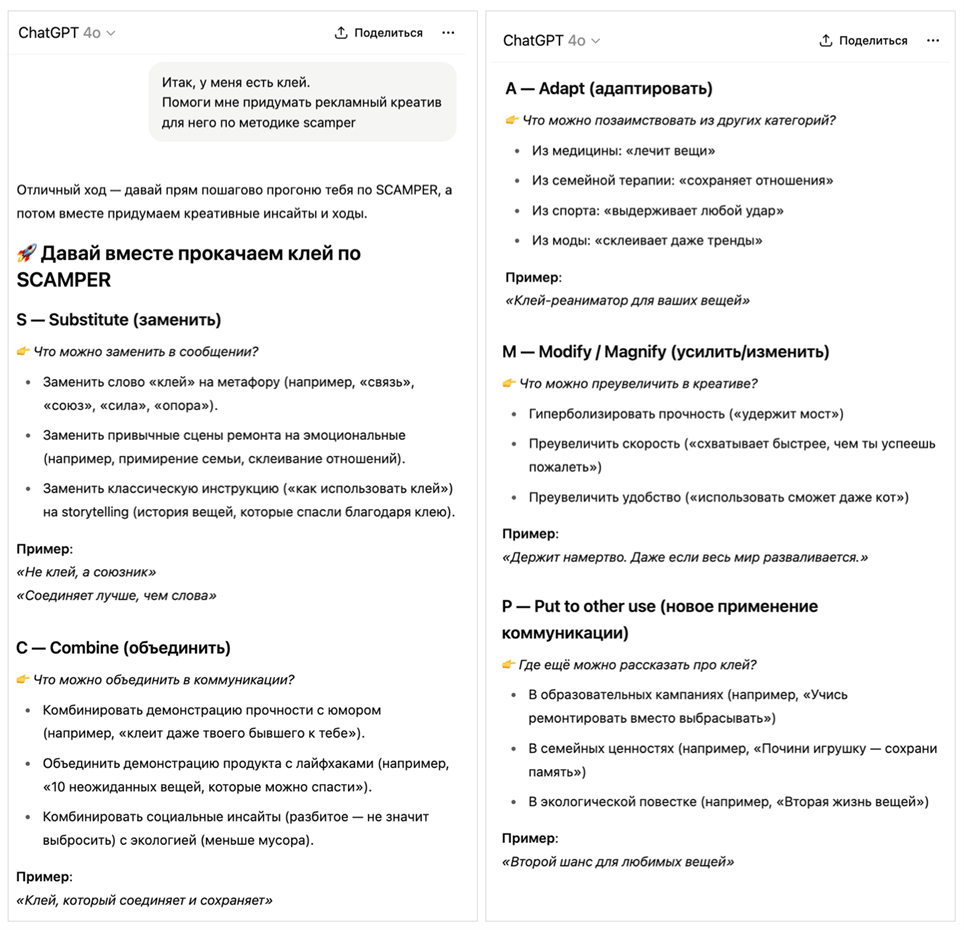 Кстати, иногда нейросеть подходит к технике SCAMPER слишком буквально и начинает менять сам продукт. Нам это не надо. Поэтому не лишним будет внести корректировку, например такую: «Я не могу ничего изменить в самом продукте. Клей останется клеем. Меняем только коммуникацию, используя SCAMPER». Нейросеть подстроится и выдаст уже более реальный результат.