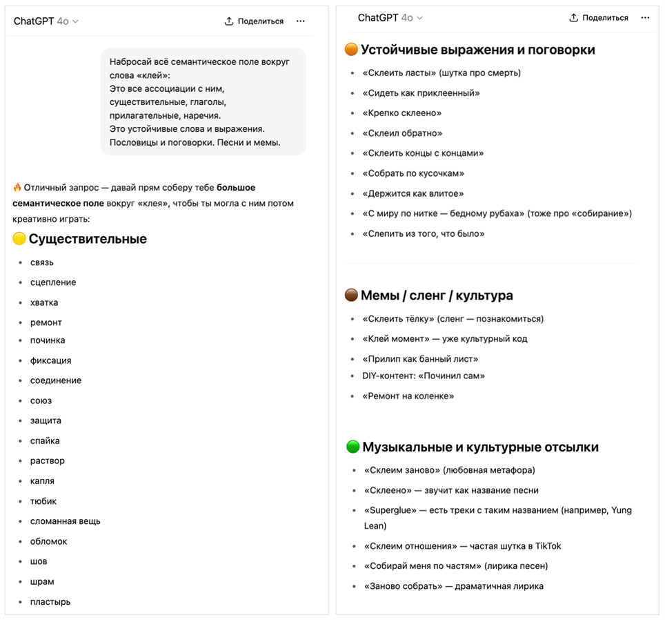 Ещё один верный способ написать слоган – побродить по семантическим полям. У каждого слова есть семантическое поле – это все слова, связанные между собой общей темой. Скажем, для слова «клей» мы будем исследовать все слова, которые хоть как-то к нему относятся: от существительных и глаголов до мемов и песен. На пересечении смыслов будем искать нужный образ и формулировку. Это можно сделать и самостоятельно с помощью словарей и поисковика, но нейросети в этой задаче здорово экономят время.