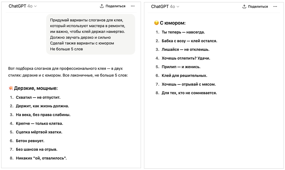 Хорошая идея для промта: «Мне нужно сделать рекламный слоган для клея. Помоги исследовать эту тему. Задай мне вопросы, выводящие на проблемы и боли, которые закрывает продукт».