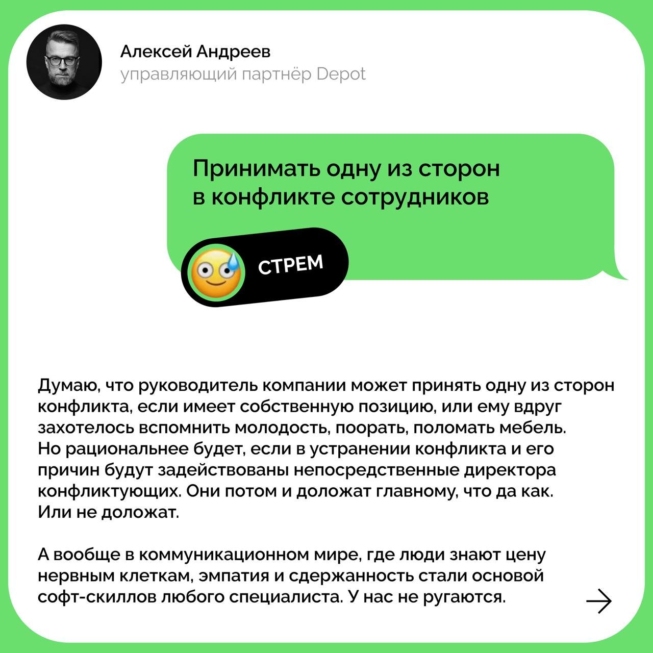 Так Алексей Андреев, управляющий партнёр Depot, отвечает на вопрос о конфликтах на работе