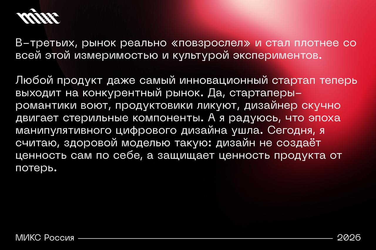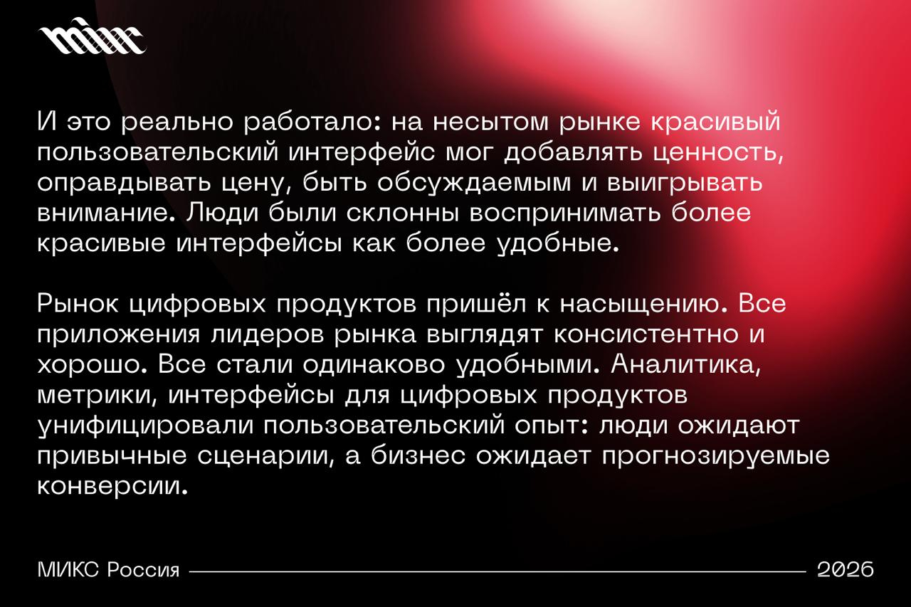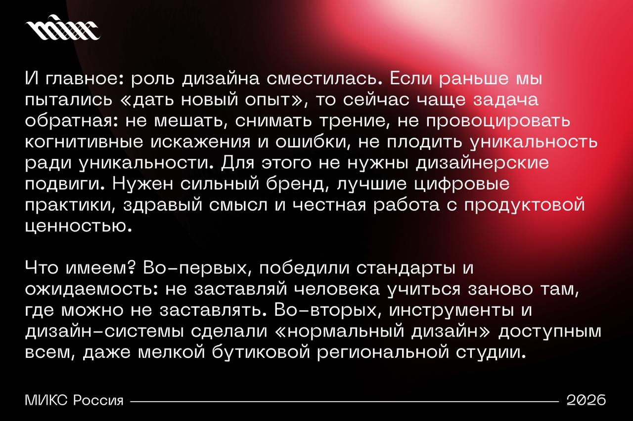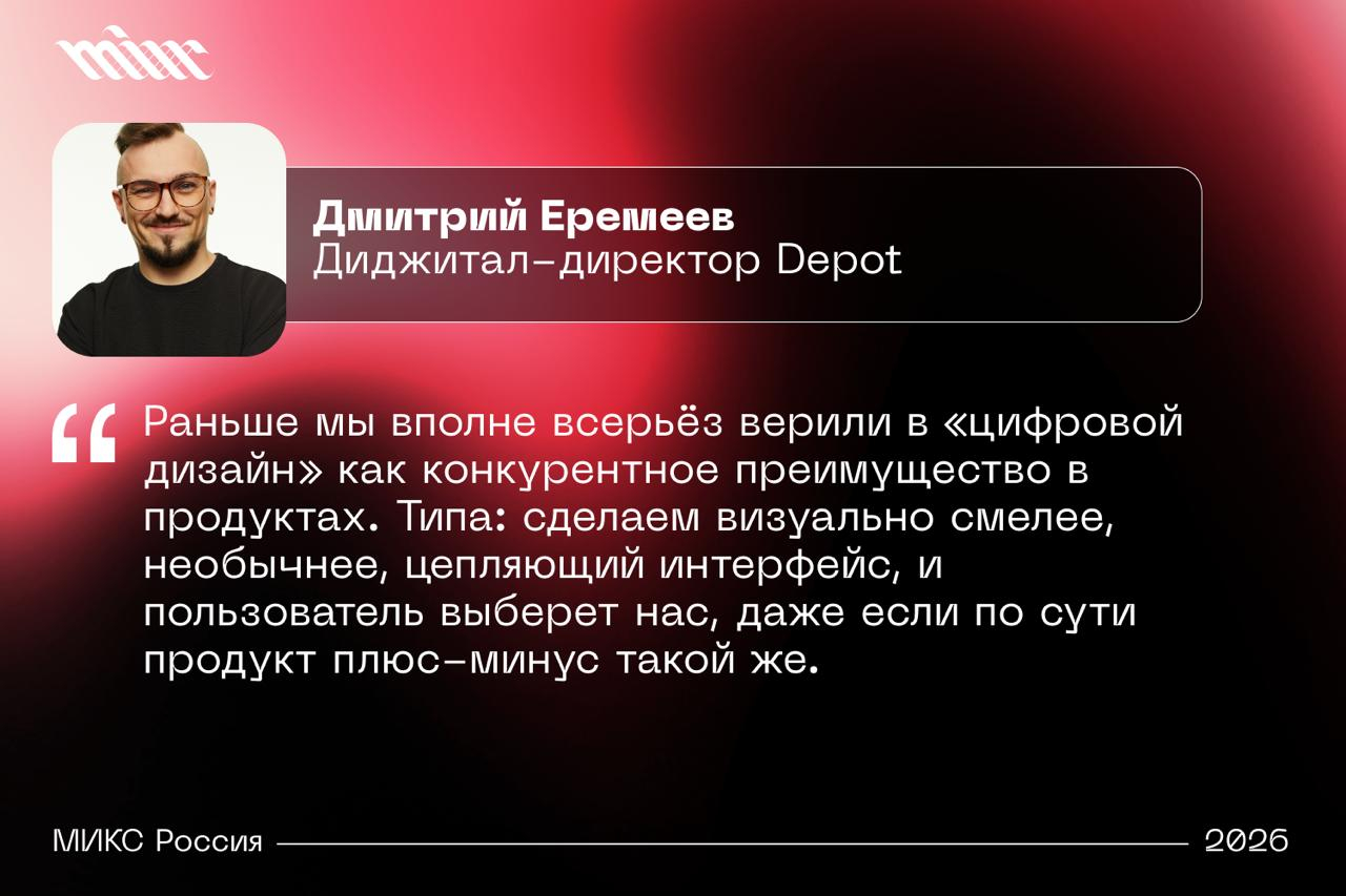 Дмитрий Еремеев, диджитал‑директор Depot, в комментарии для МИКС Россия объясняет, почему цифровой дизайн в 2026 году больше не является самоцелью и конкурентным преимуществом.