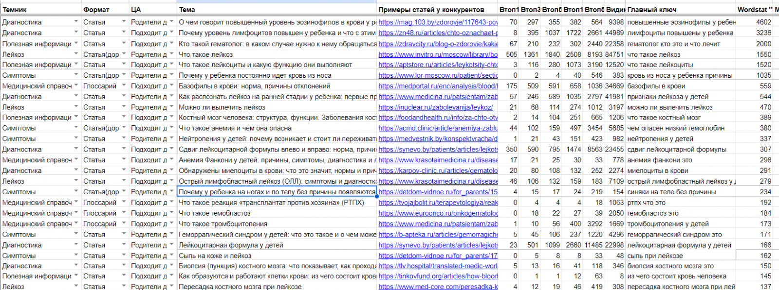 Сначала нужно было настроить коммуникацию с фондом и совместиться по пониманию задачи. И первая сложность, с которой мы столкнулись — выбор тем. Выяснилось, что многие темы, которые фонд считает важными, пользователи не ищут в интернете — на них нет поискового спроса или он низкий. А многие частотные темы казались клиенту слишком общими и не связанными с лейкозом напрямую. Такими, например, были статьи об изменениях разных показателей крови.