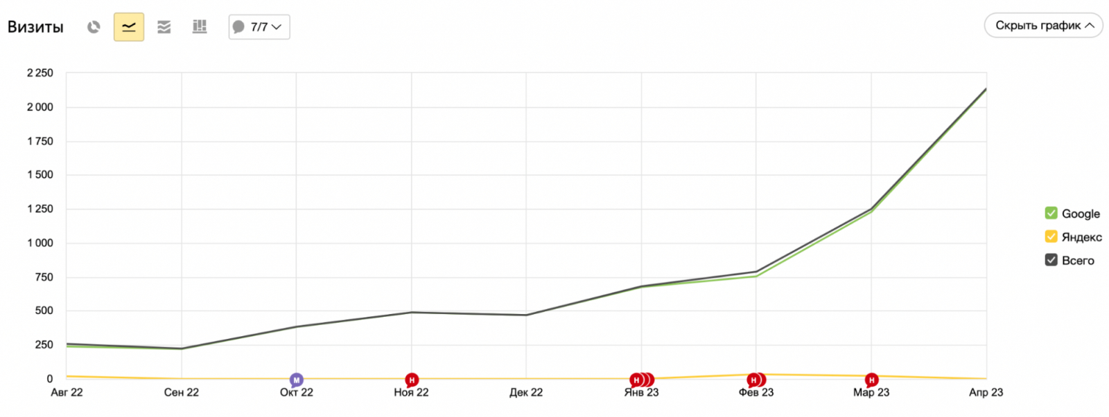В апреле трафик в обеих поисковых системах — 2 128. С начала работ трафик вырос в 5,5 раз.
