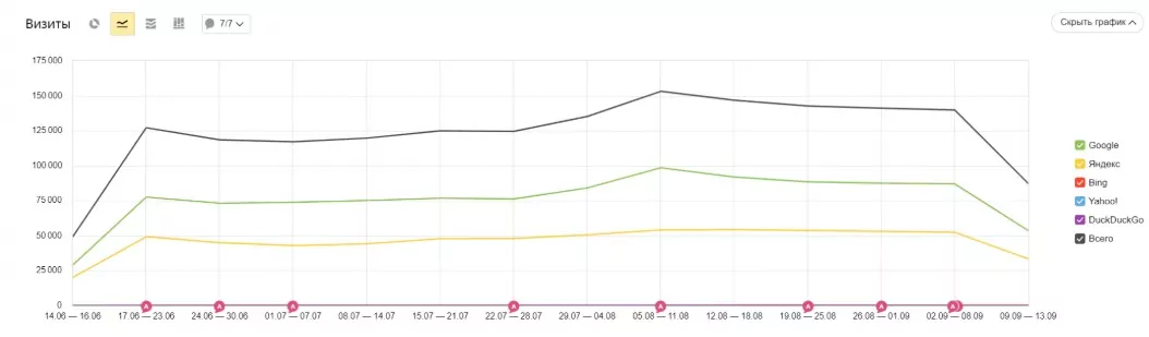 Если трафик упал, но видимость в поиске не изменилась, причина может быть в сезонности. В таких случаях дорабатывать эти материалы не имеет смысла.
