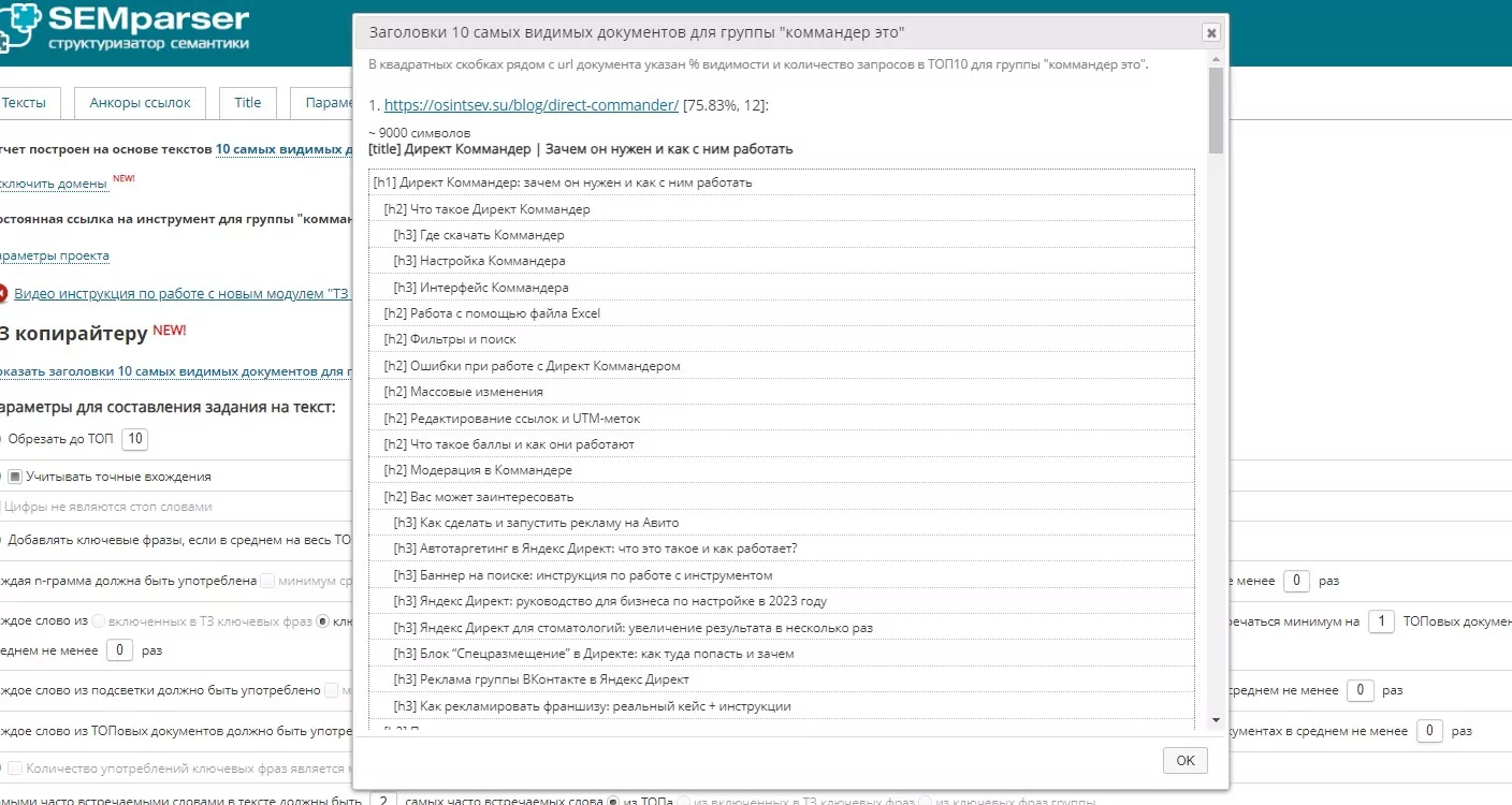 4. Формируем новое семантическое ядро. Для этого выгружаем семантику конкурентов, очищаем ее от нерелевантных, мусорных запросов. Оставляем не более 35 запросов. Загружаем их в сервисы вроде Semparser, которые автоматически распределяют ключи по группам и помогают сформировать структурированное ТЗ для автора.