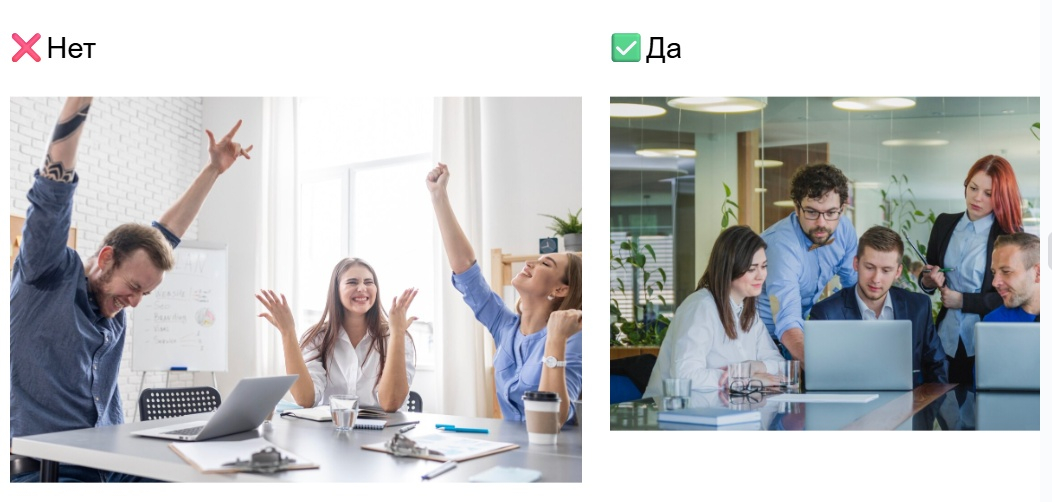 Выбирайте естественные фотографии: повседневные сцены и узнаваемые ситуации. Если пишете про офисную работу, лучше поставить фото обычных людей на работе, чем обнимающуюся команду в галстуках и с белоснежными улыбками. Такие фото с неестественными эмоциями и позами отражают то, с чем вряд ли часто сталкивается читатель, поэтому скорее отталкивают.