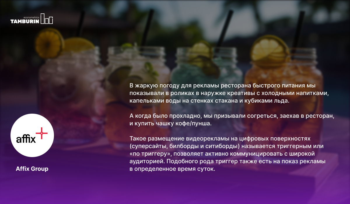 Мы с командой предложили эксперимент: в жаркую погоду делать упор на доставку прохладительных напитков в составе комбо, а в холодные дождливые дни — на теплые супы и горячие блюда. Поскольку это была сеть по всей России, то приходилось отслеживать погоду во всех обслуживаемых регионах, но эксперимент в итоге оказался успешным. Фактически, мы продавали то, что и хотели, отталкиваясь при этом от пищевых предпочтений пользователей в конкретную погоду.