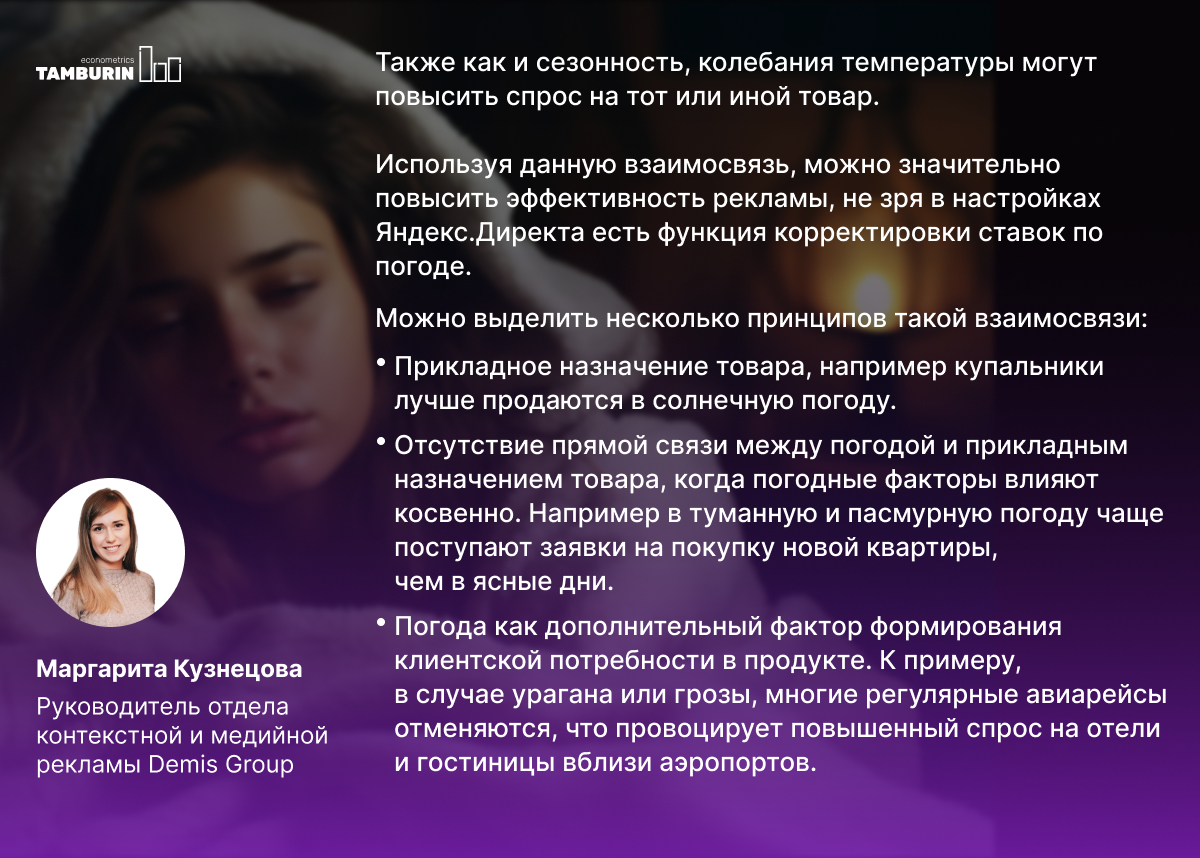 Ситуативная часть связана с погодными изменениями в рамках недели или дня. Например, у вас есть ресторан, и к теплому июлю в комплексной стратегии было запланировано перераспределение дохода из доставки в офлайн-точки. Но первая неделя июля оказалась дождливой, что заставило многих людей оставаться в рамках дома/офиса и пользоваться преимущественно доставкой. Таким образом, вместо планового роста трафика в офлайн-рестораны мы получаем рост запросов, связанных с доставкой еды онлайн. Аналогичное влияние можно наблюдать в плохую погоду, когда пользуемся сервисом Яндекс.Такси и видим повышенные тарифы.