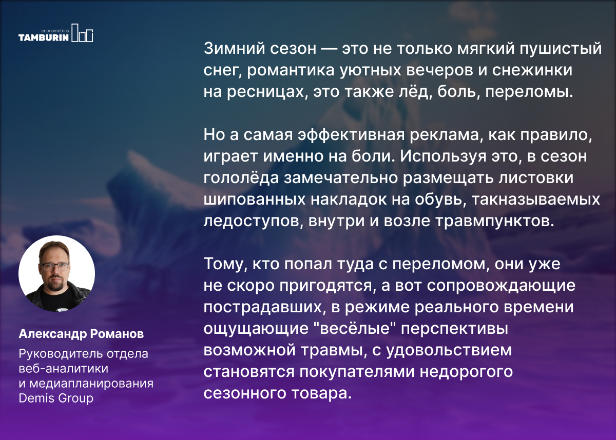 Есть такое понятие метеочувствительный маркетинг. Это изменение покупательской активности в зависимости от погоды. Например, во время снегопада или в дождь пропадает желание идти в магазин. А холодильник пустой. Что делать? В такие моменты отлично работает реклама доставки продуктов или еды. Несмотря на длительный срок ожидания, большинство людей готовы скорее смириться с этим неудобством, чем выйти на улицу и совершить покупки самостоятельно.