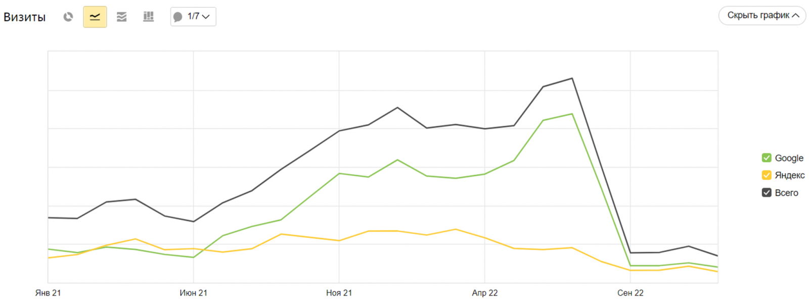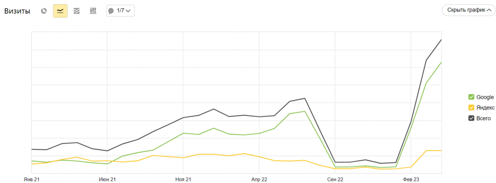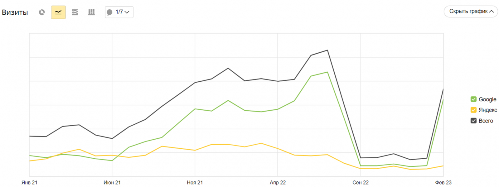 За семь месяцев с момента обращения клиента мы увеличили трафик на сайт в 15 раз. Нам удалось не только вернуть потерянный трафик из поиска, но и в два раза превысить пиковый рубеж за последние два года.