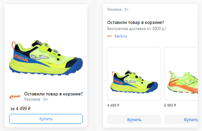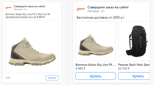 Объявления в кампаниях с каталогом товаров создаются автоматически в двух вариантах: товарный баннер с одним товаром или товарная карусель. Каждая карточка товара вела на страницу товара на сайте КАНТ.