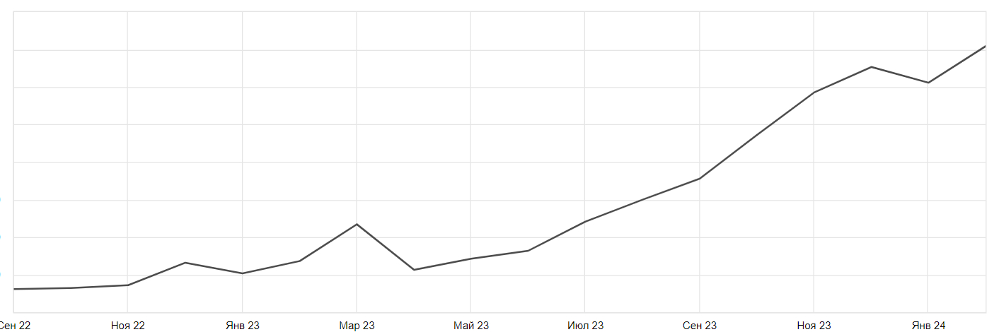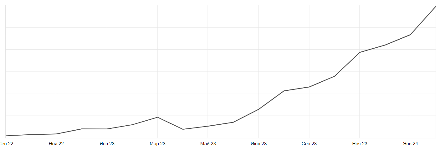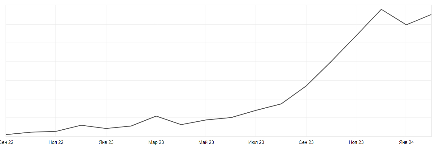 Посещаемость раздела «Блог» выросла в 68,7 раз, а доля уникальных посетителей — в 65,7 раз. Пиковое значение по количеству уникальных посетителей было достигнуто в декабре 2023 года с продолжающейся восходящей динамикой.