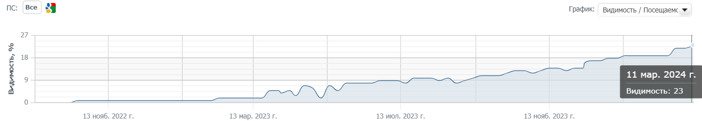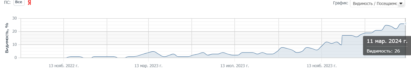 За время ведения сайта нам удалось увеличить видимость по продвигаемому семантическому ядру в обоих поисковиках: