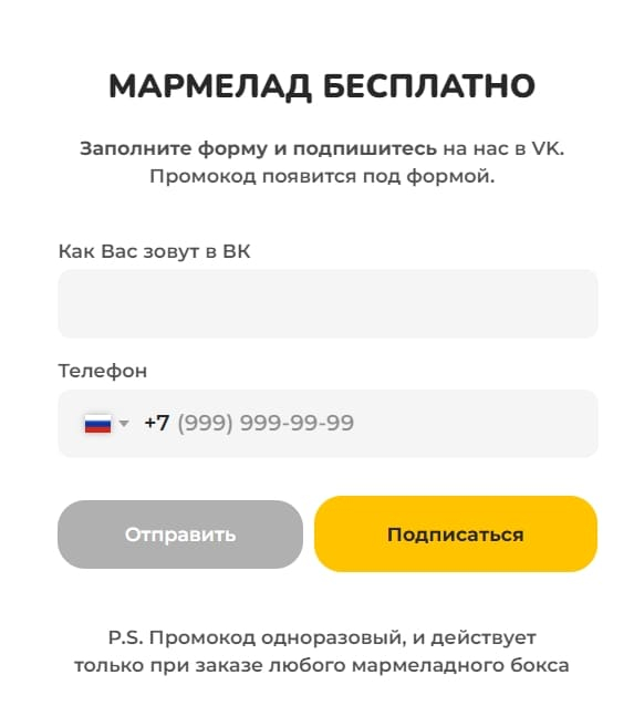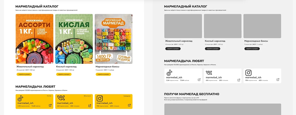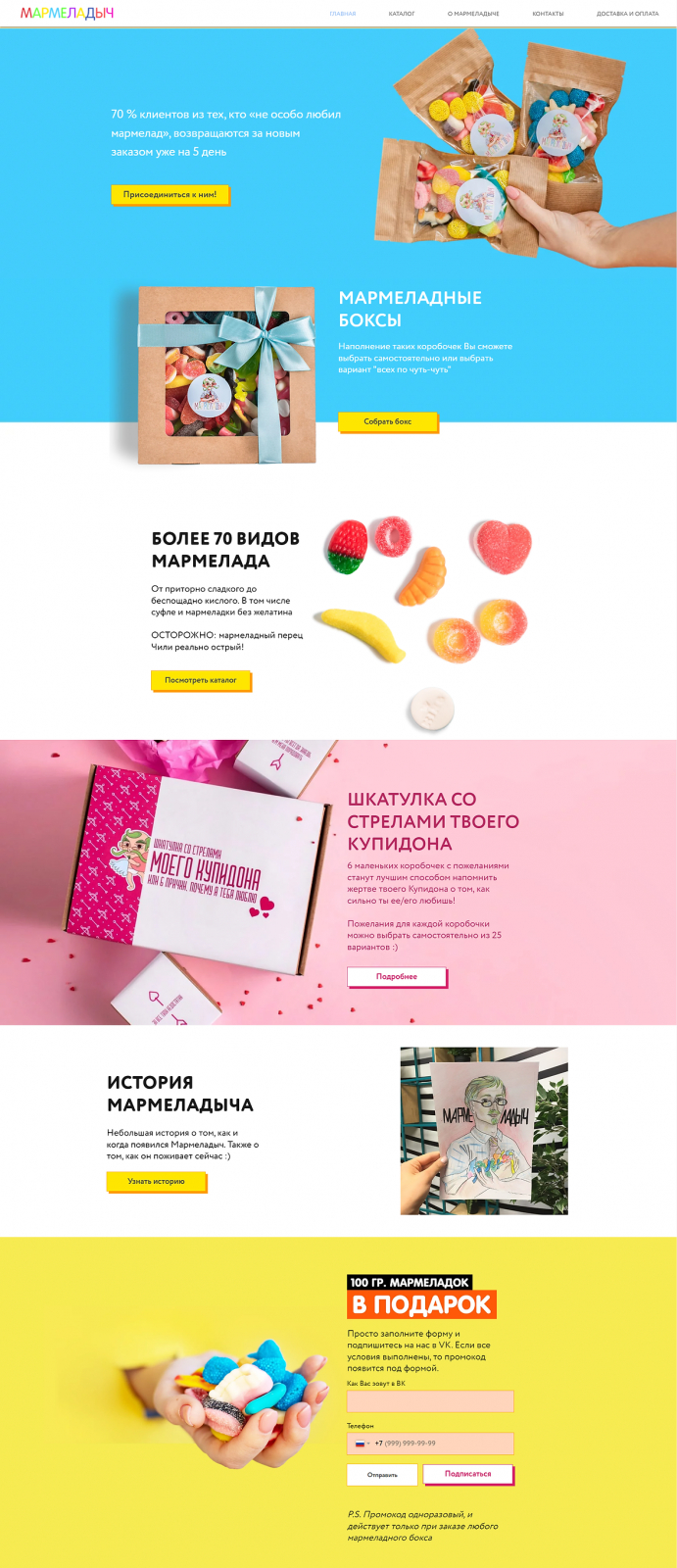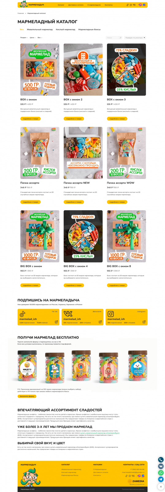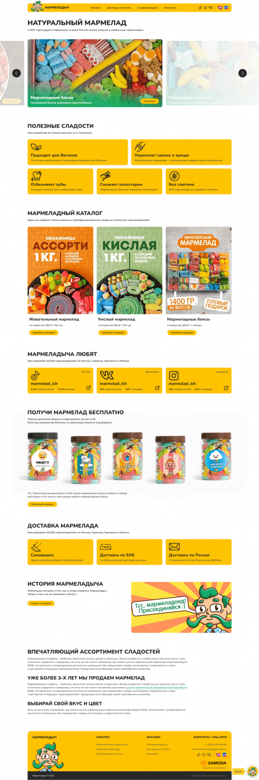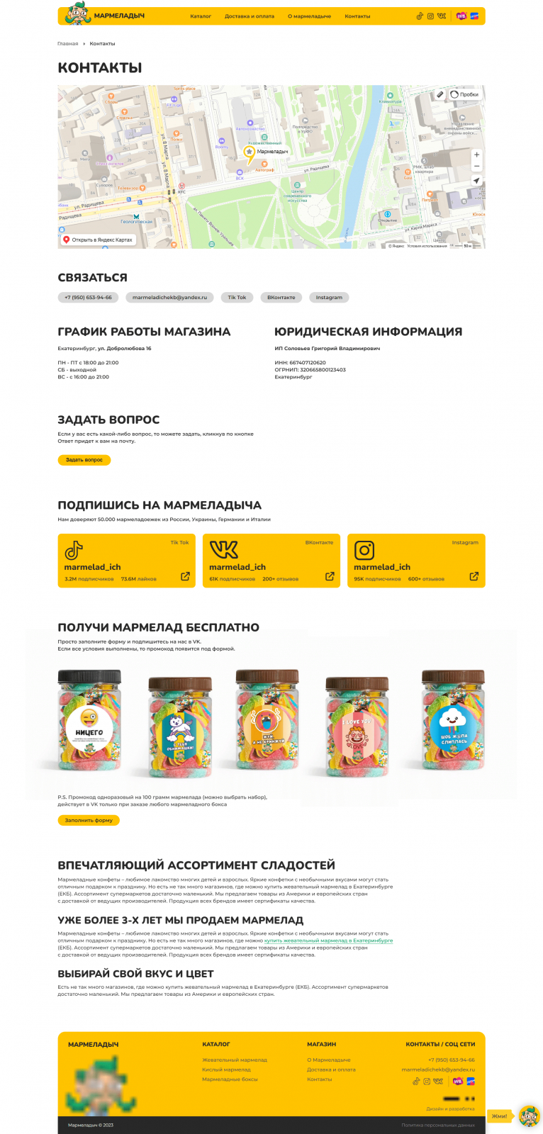 На всех страницах сайта продублированы показатели соцсетей и возможность бесплатного получения мармелада. Ведь это является хорошим входом в воронку продаж.