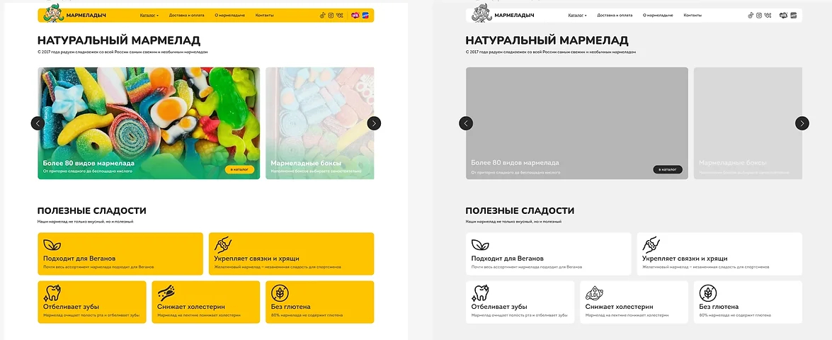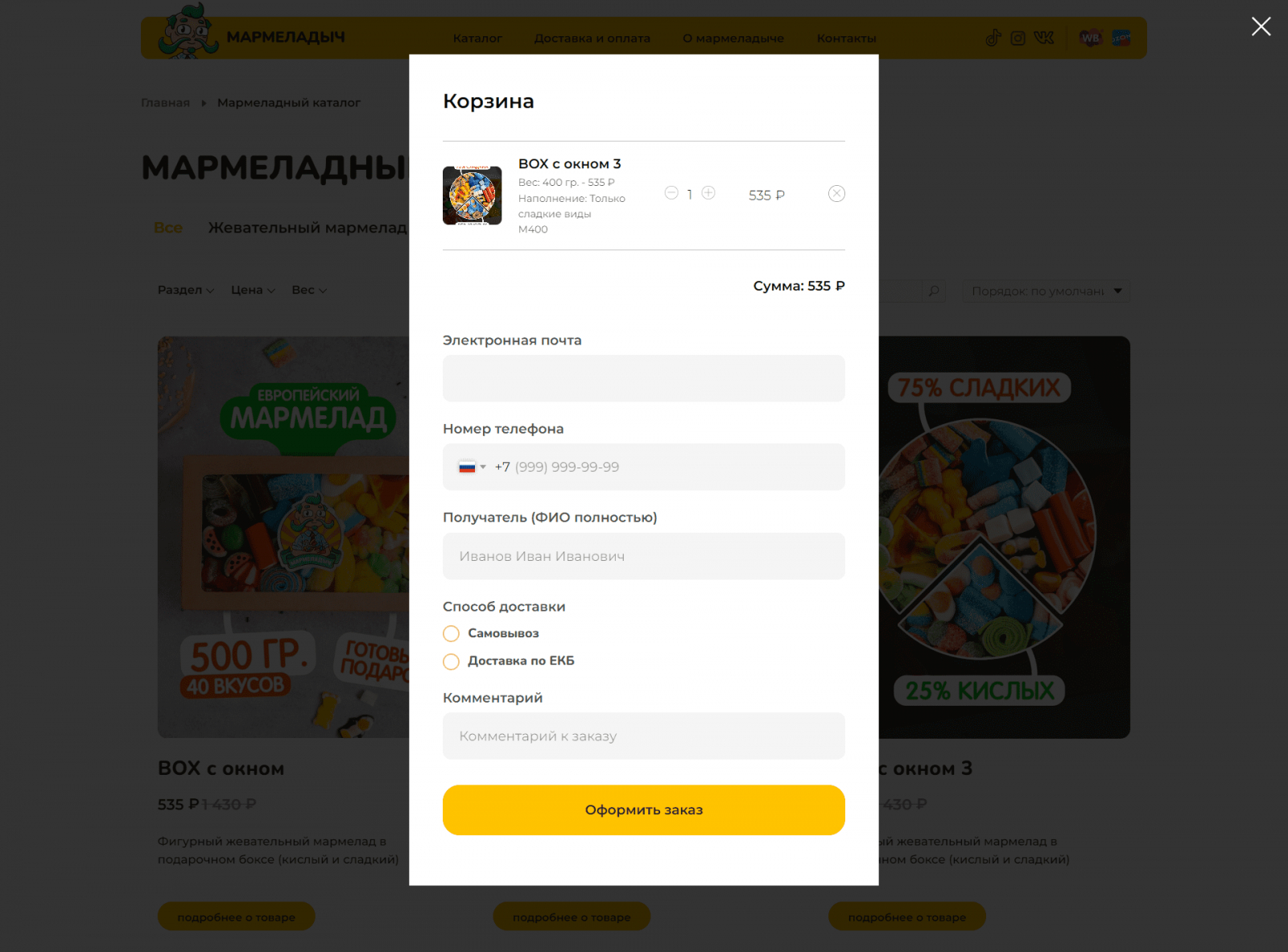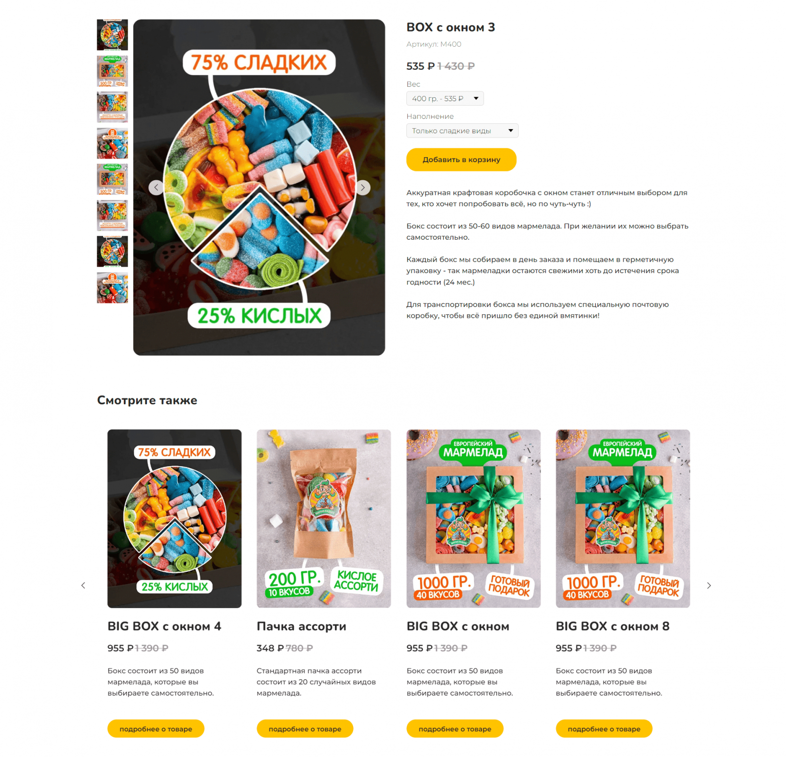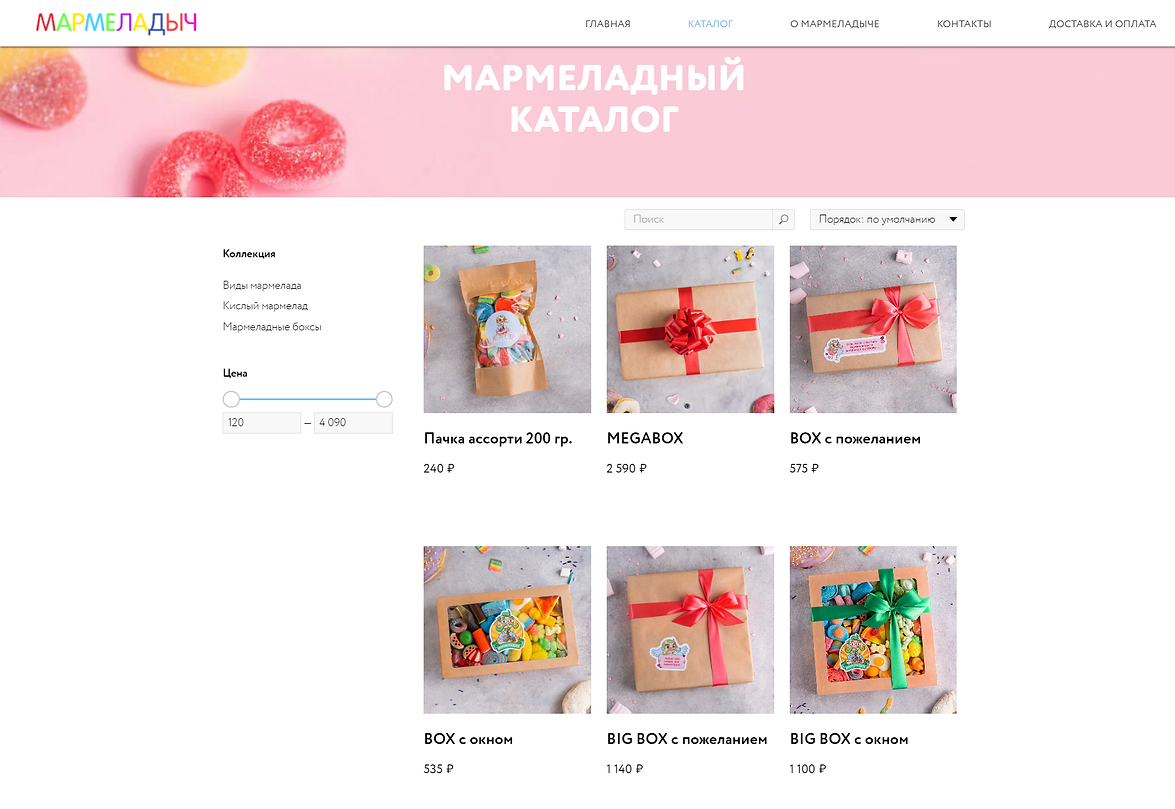 - Функции организации каталога (фильтры по категориям / наборам / видам мармелада, товарные метки «Хит» и «Новинка», поиск по ключевому слову, сортировка по цене, рекомендуемые товары под карточками товаров);