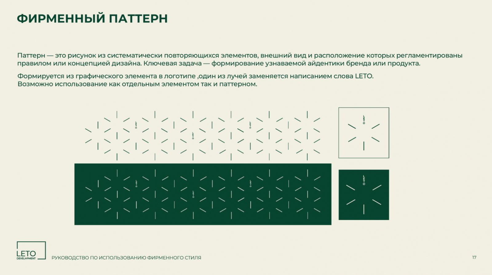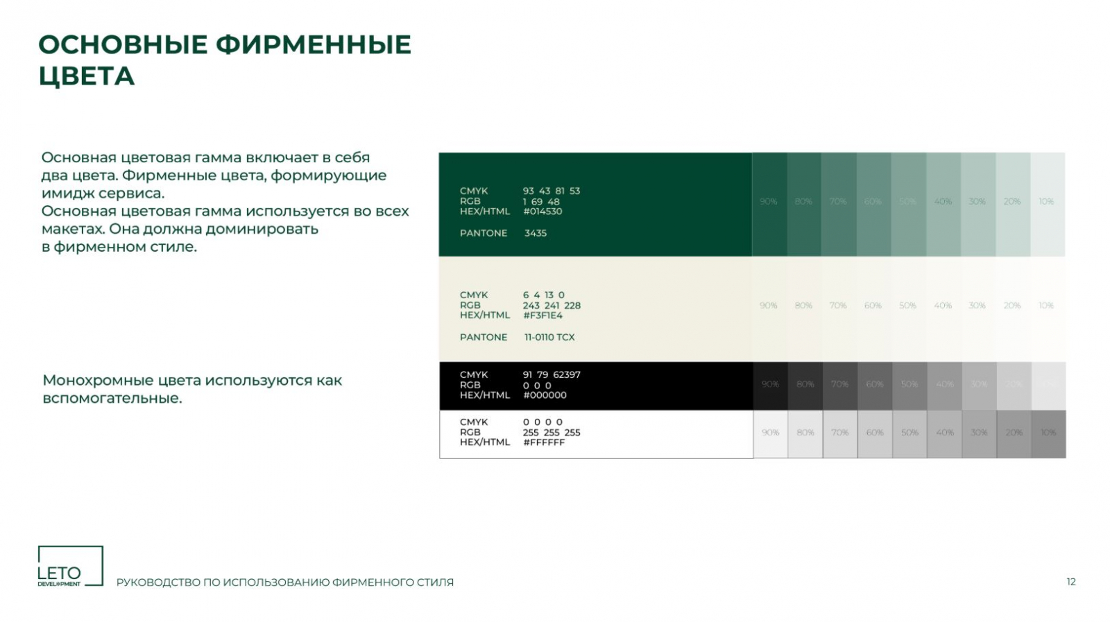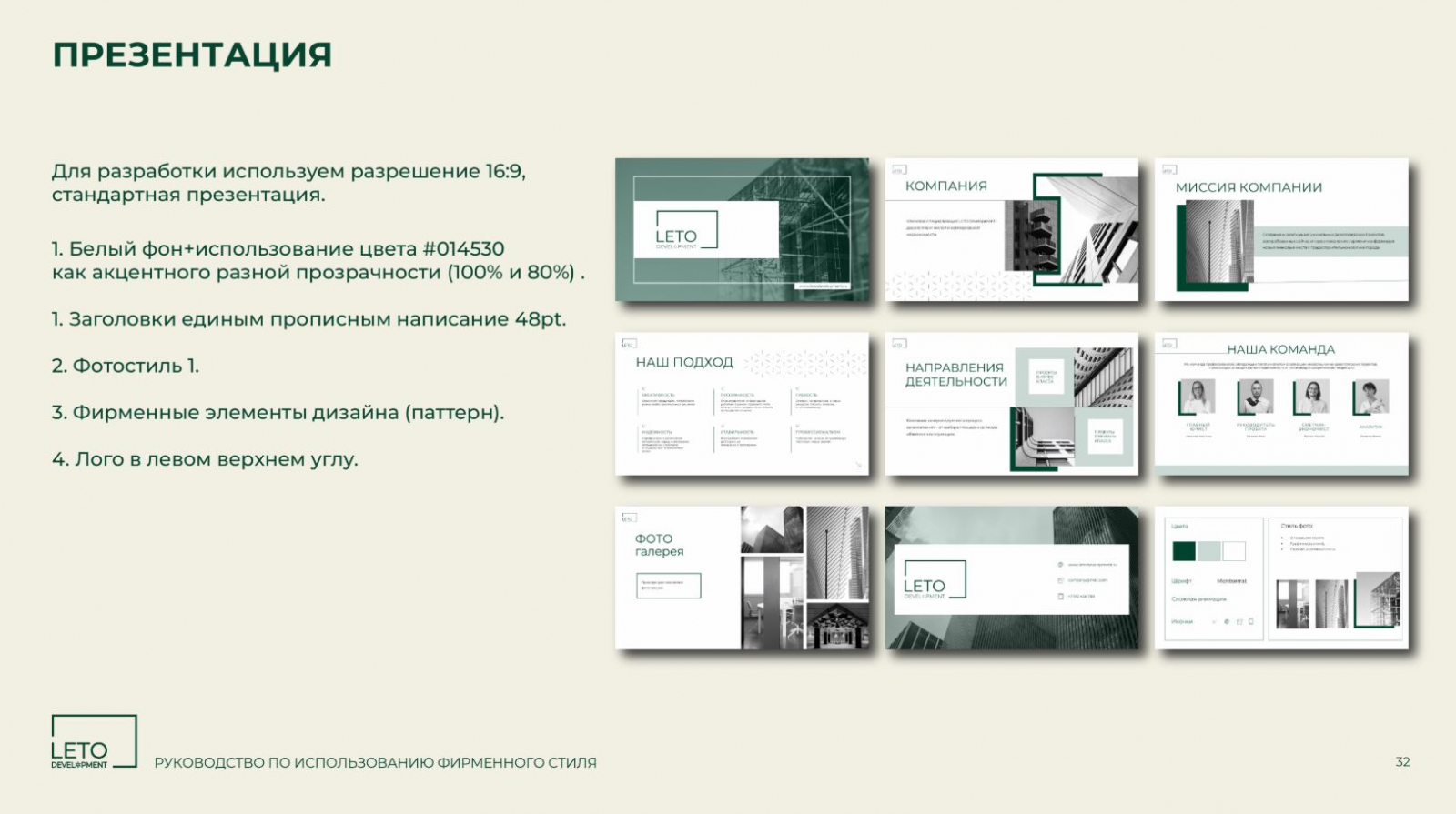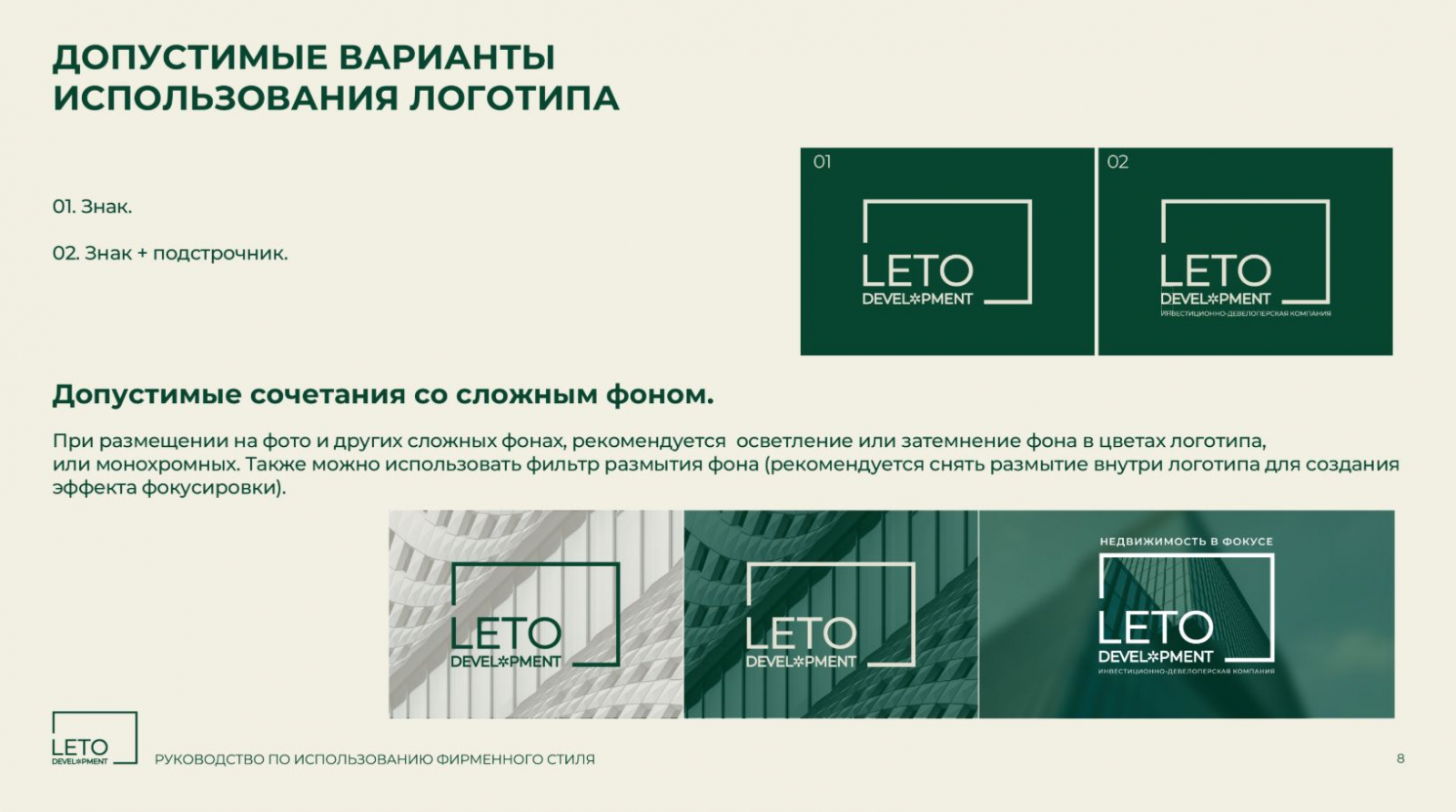 Разработанный фирменный стиль полностью соответствует позиционированию компании и её ценностям. Строгий, но современный дизайн подчёркивает надёжность и инновационность АО «ЛЕТО ДЕВЕЛОПМЕНТ», что особенно важно для работы с бизнес-партнёрами и государственными структурами. Команда брендингового агентства ZAMEDIA реализовала проект в установленные сроки и подготовила фирменный стиль к дальнейшему развитию.