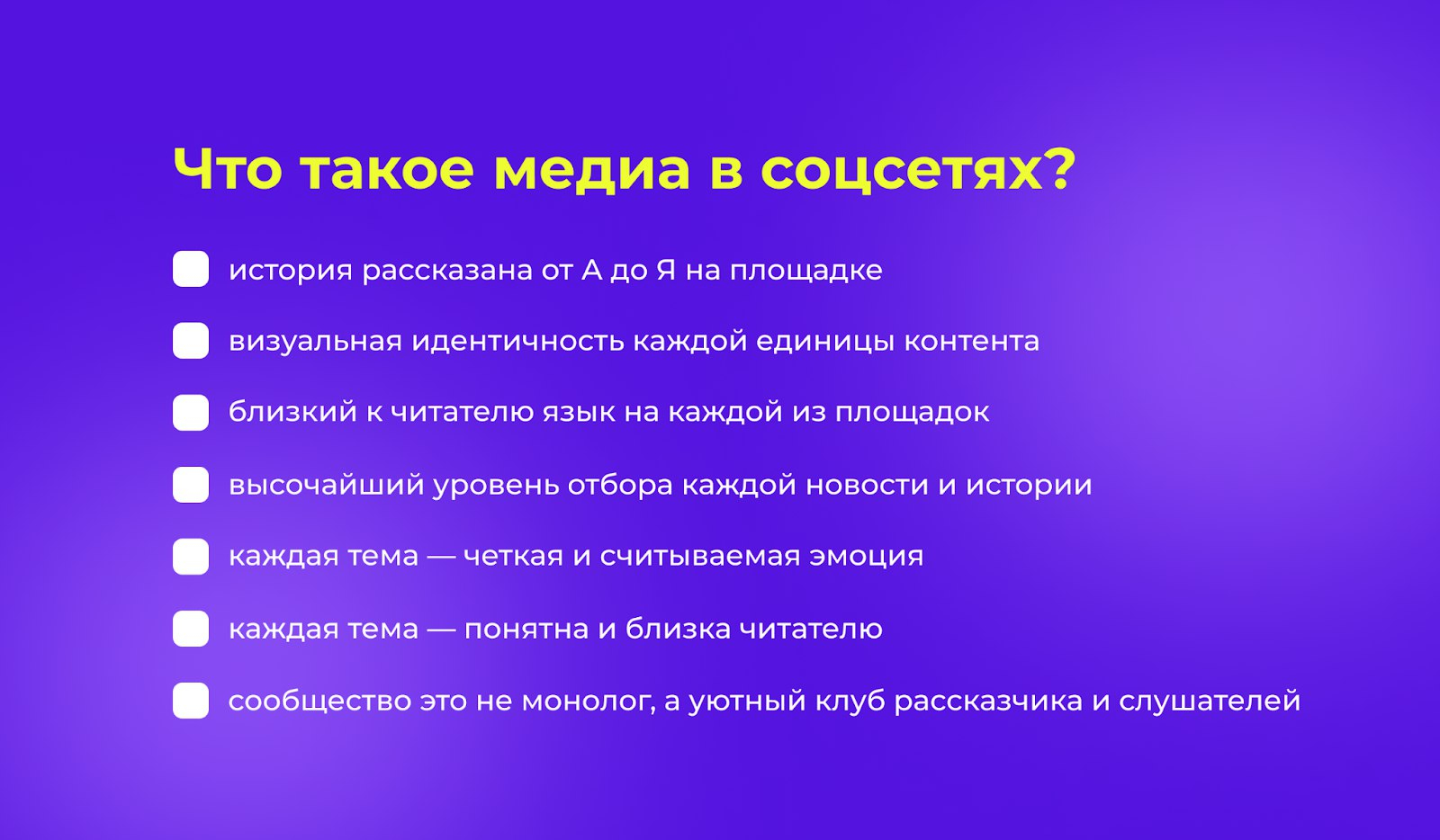 Действовать нужно было решительно. Но как разом перевести соцсети СМИ с традиционных рельсов на новые? Правильный ответ — никак. Поэтому мы решили воспринимать наши площадки в каждой соцсети как отдельное полноценное медиа и составили перечень требований к такому формату. Он и стал нашим планом работ: