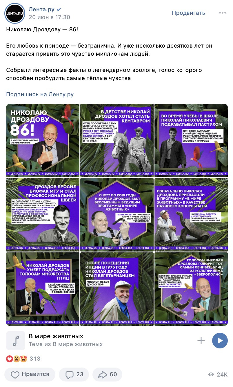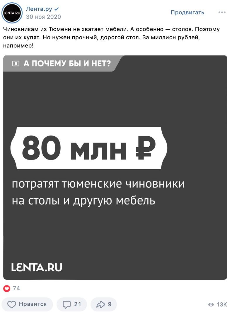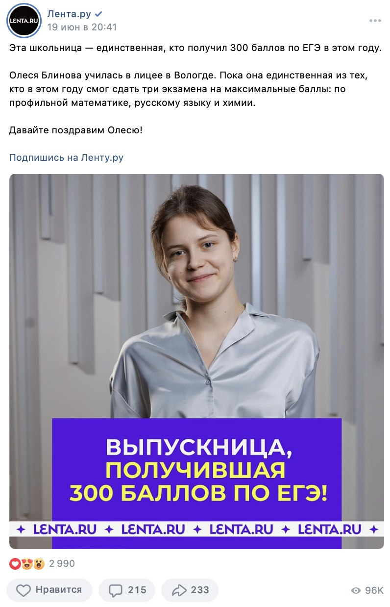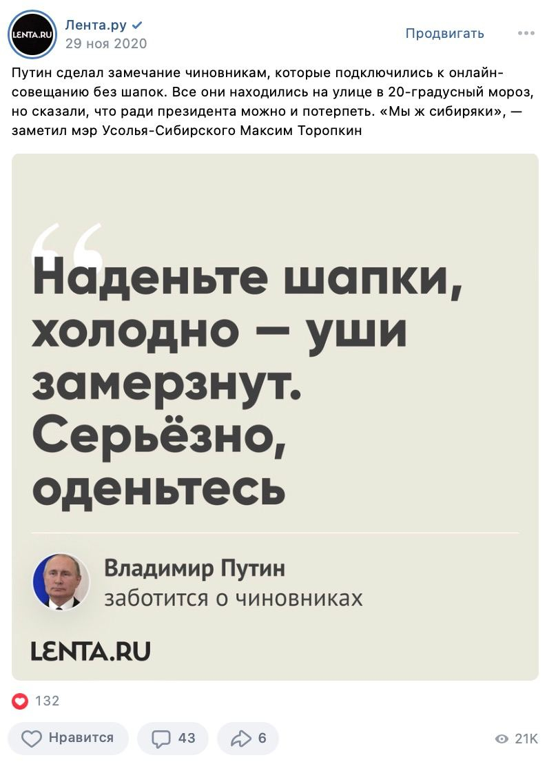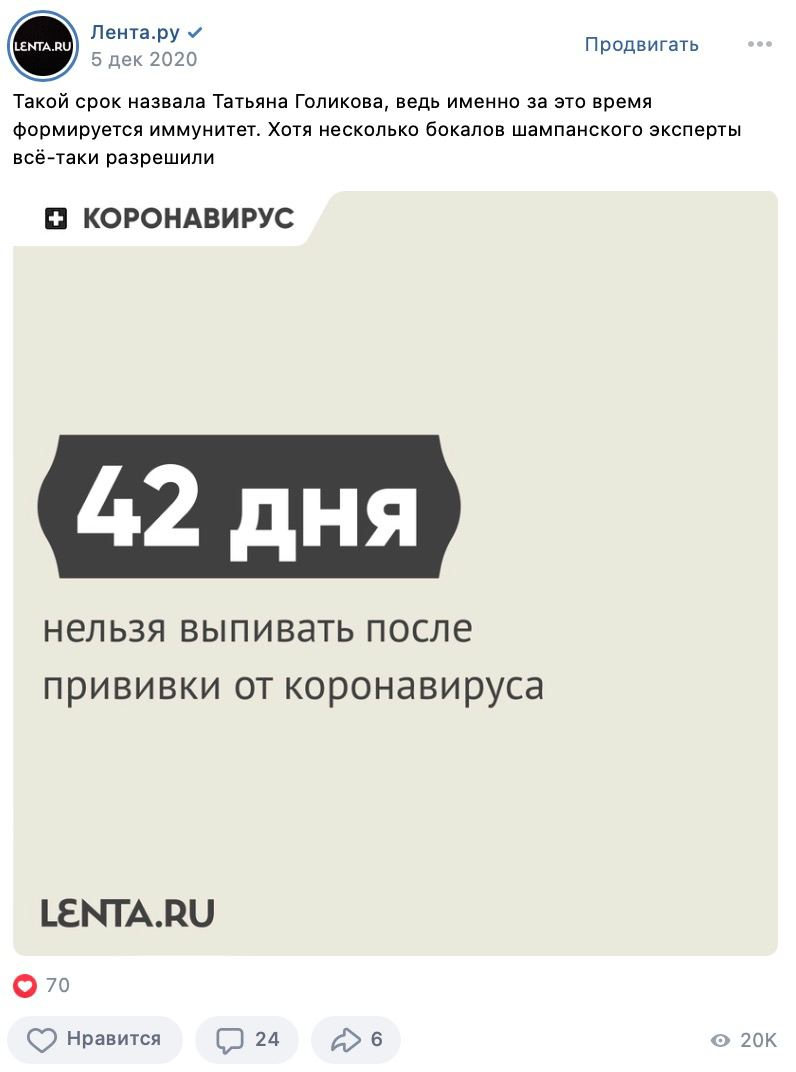 Ура! Теперь мы выглядим консистентно, простота и чистота выделяются в ленте, а спустя несколько постов любой читатель должен запомнить, что такая картинка — это «Лента.ру». Когда с визуалом дела стали обстоять в разы лучше, пришло время причесать ценности и «понятности» контента.
