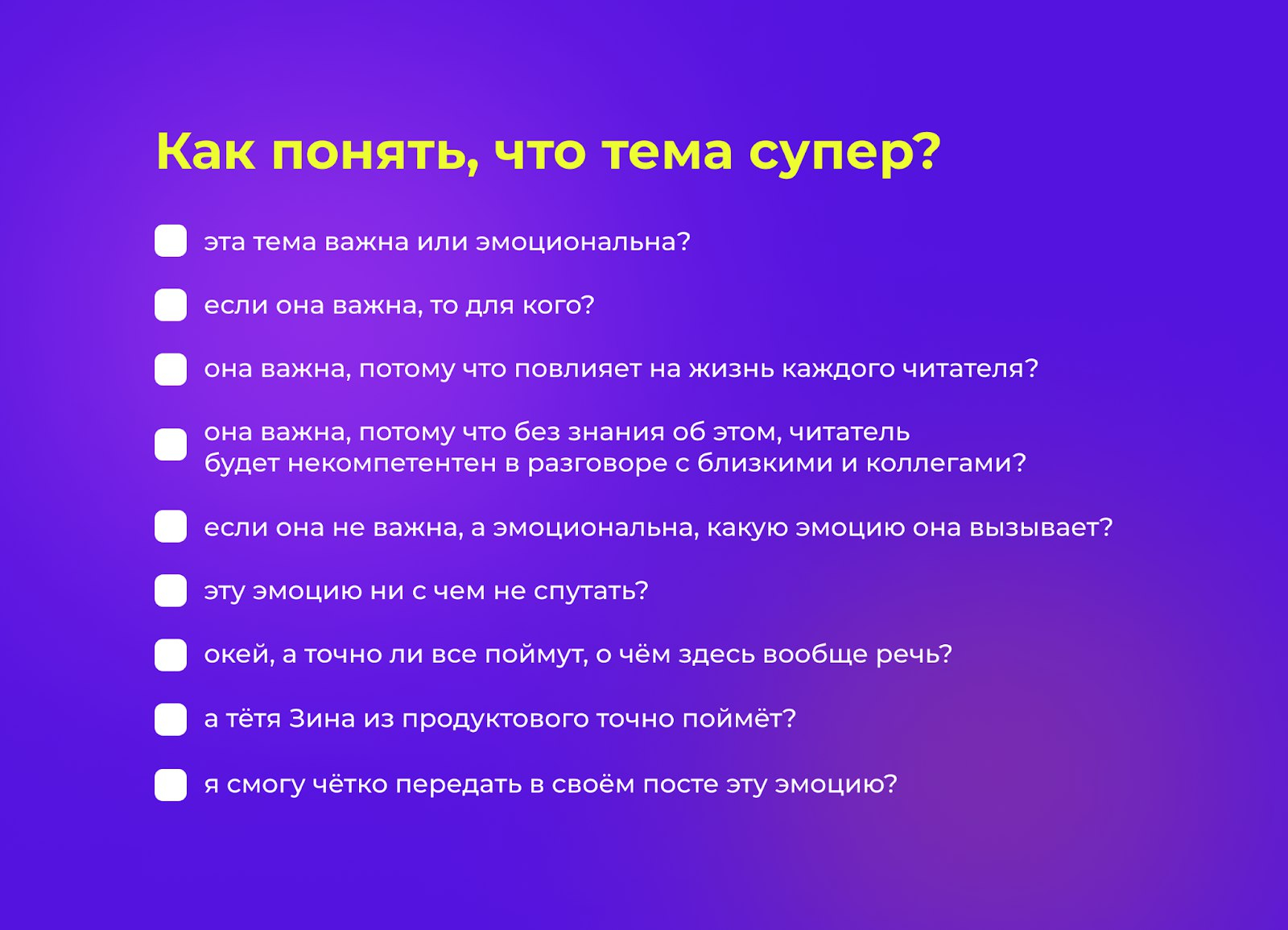 Вообще отбор любой новости или истории происходит следующим образом: редактор задаёт себе ряд вопросов и, лишь ответив утвердительно на каждый из них, берёт тему в работу. Что это за вопросы?