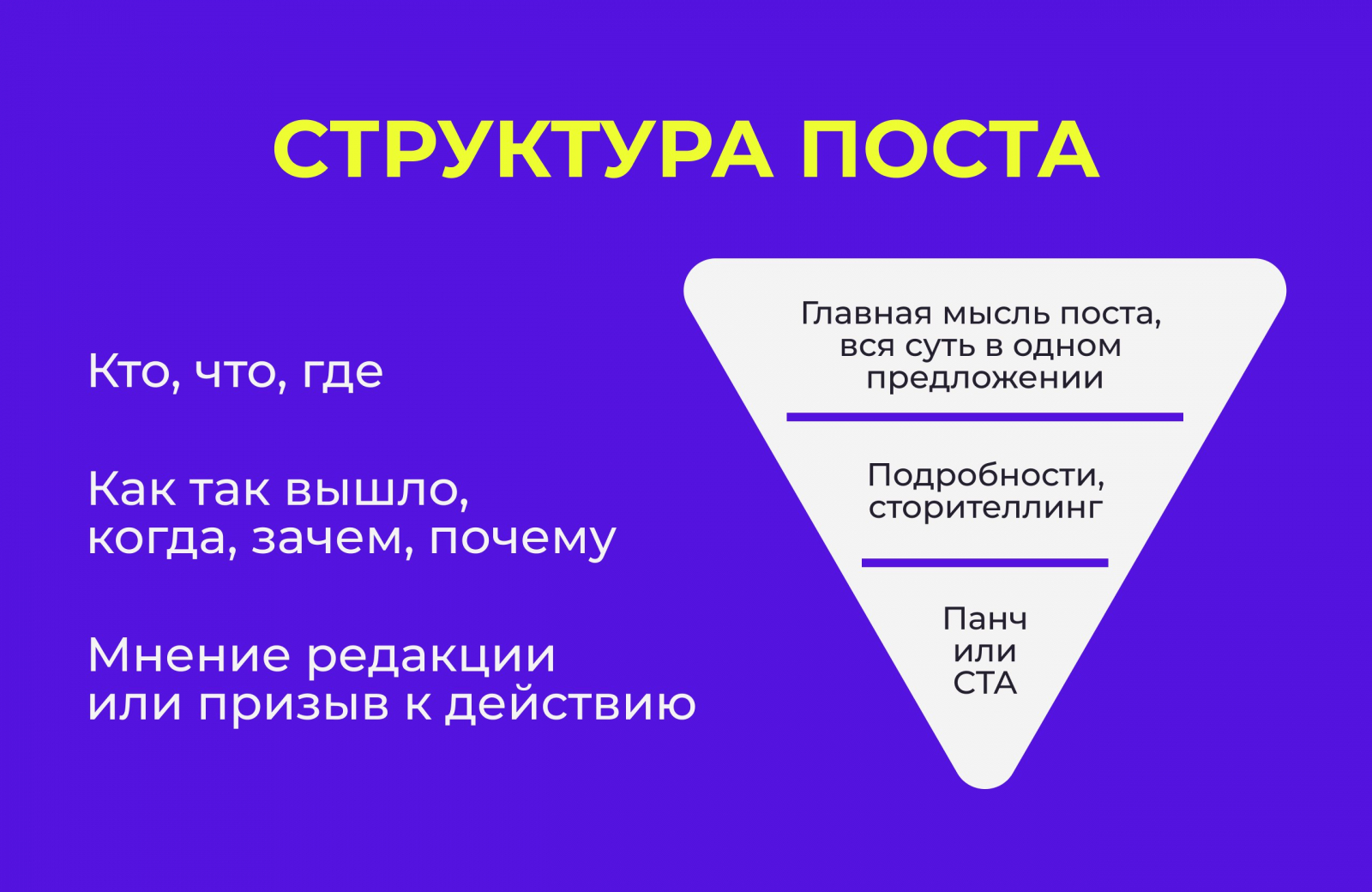 В свою работу над текстами мы внедрили классическую схему перевёрнутой пирамиды, когда информация в посте располагается по снижению важности.