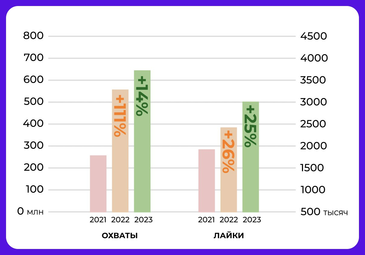 Быстрая интеграция новых правил, ежеминутный контроль за их соблюдением и, пожалуй, лучшая команда социальных медиа на российском рынке позволили до конца 2021 года нарастить охваты на пост на 120%, а реакции — почти на 30%. За следующий год мы выросли на 10% и 25%, соответственно. Сейчас нас читают 700 тысяч человек во «ВКонтакте», 400 тысяч — в «Одноклассниках», почти 900 тысяч — в «Дзене» и более 250 тысяч — в Telegram.
