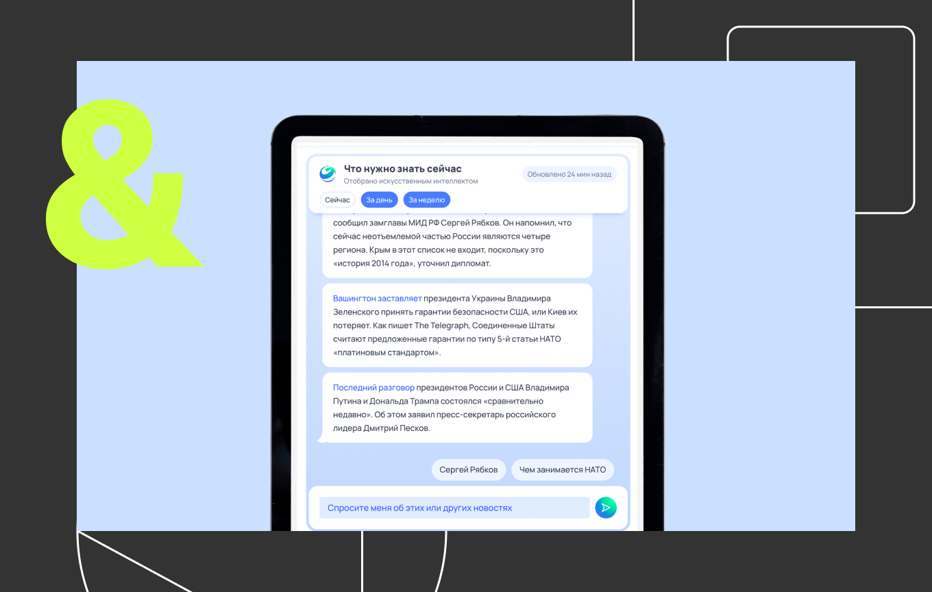 Новостной ИИ-помощник оптимизирует процесс поиска информации в разрозненных верифицированных источниках. Пользователю достаточно сформулировать вопрос в едином интерфейсе, чтобы получить структурированный и оперативный ответ. Вопрос может быть как абстрактный: «Расскажи, какие последние новости России», так и на любую конкретную тематику: «Что сказал Президент на программе ²Итоги года²?», или о происходящем в режиме реального времени: «Что происходит с самолетом Москва-Пхукет?»