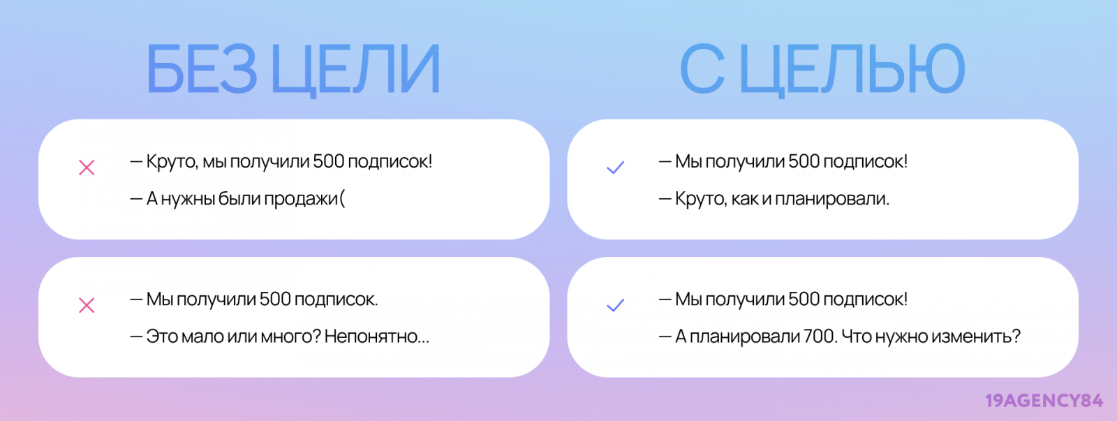 К чему ведет: если мы не сформулируем цель, то будем жить без понимания, зачем и почему что-то делаем. Какую стратегию выбрать, о чем рассказывать, как оценить результаты? Без цели на эти вопросы не ответить.Если цель изначально некорректная, то запланированных результатов, скорее всего, достичь не получится. Например, поставили цель «хотим 200 заявок с соцсетей ежемесячно», но люди привыкли бронировать вашу услугу на сайте. Цель не сопоставлена с путем покупателя (CJM) и поэтому не выполнима.