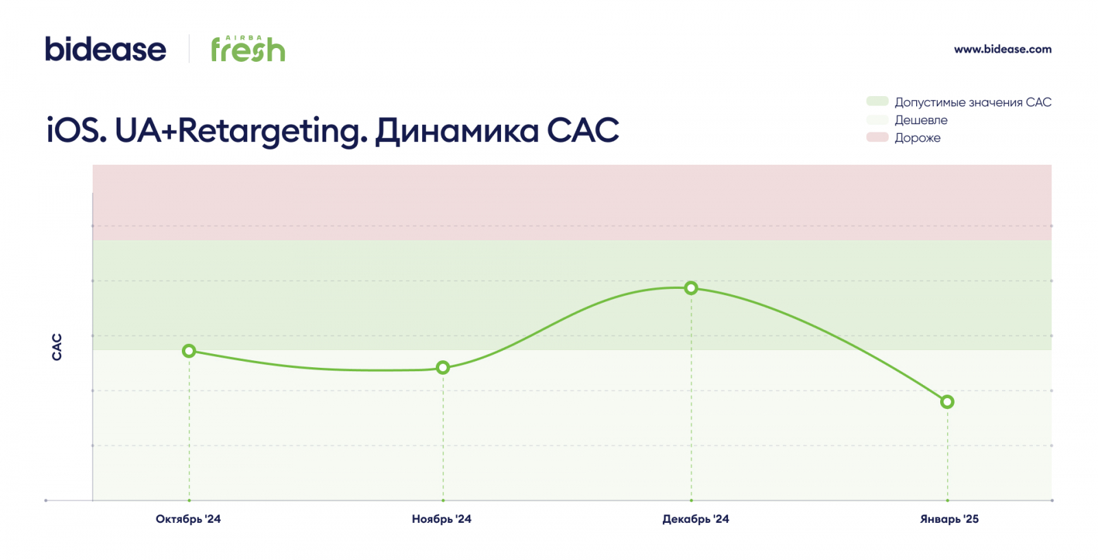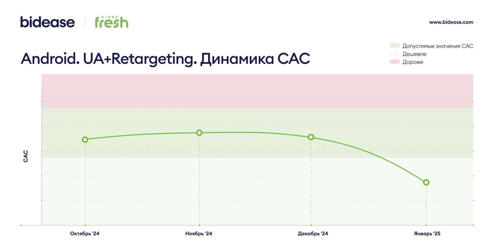 Следующие графики наглядно демонстрируют, что за время флайта мы укладывались в KPI по CAC. Зелёным цветом отмечена зона допустимых значений по стоимости привлечения клиента для iOS и Android. В некоторые месяцы мы привлекали пользователей дешевле значений нижней границы KPI по CAC.