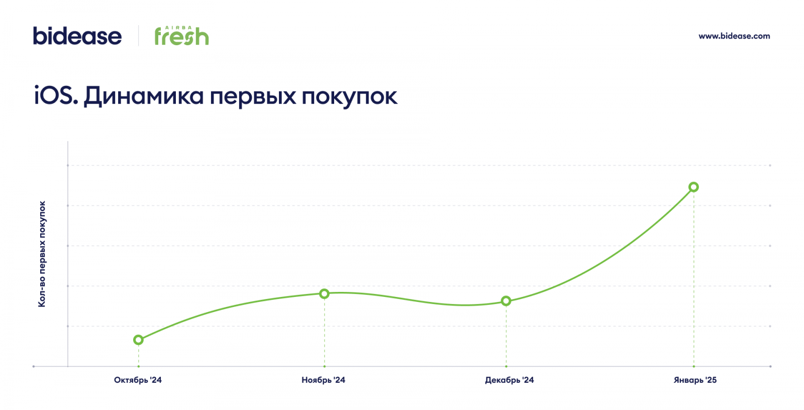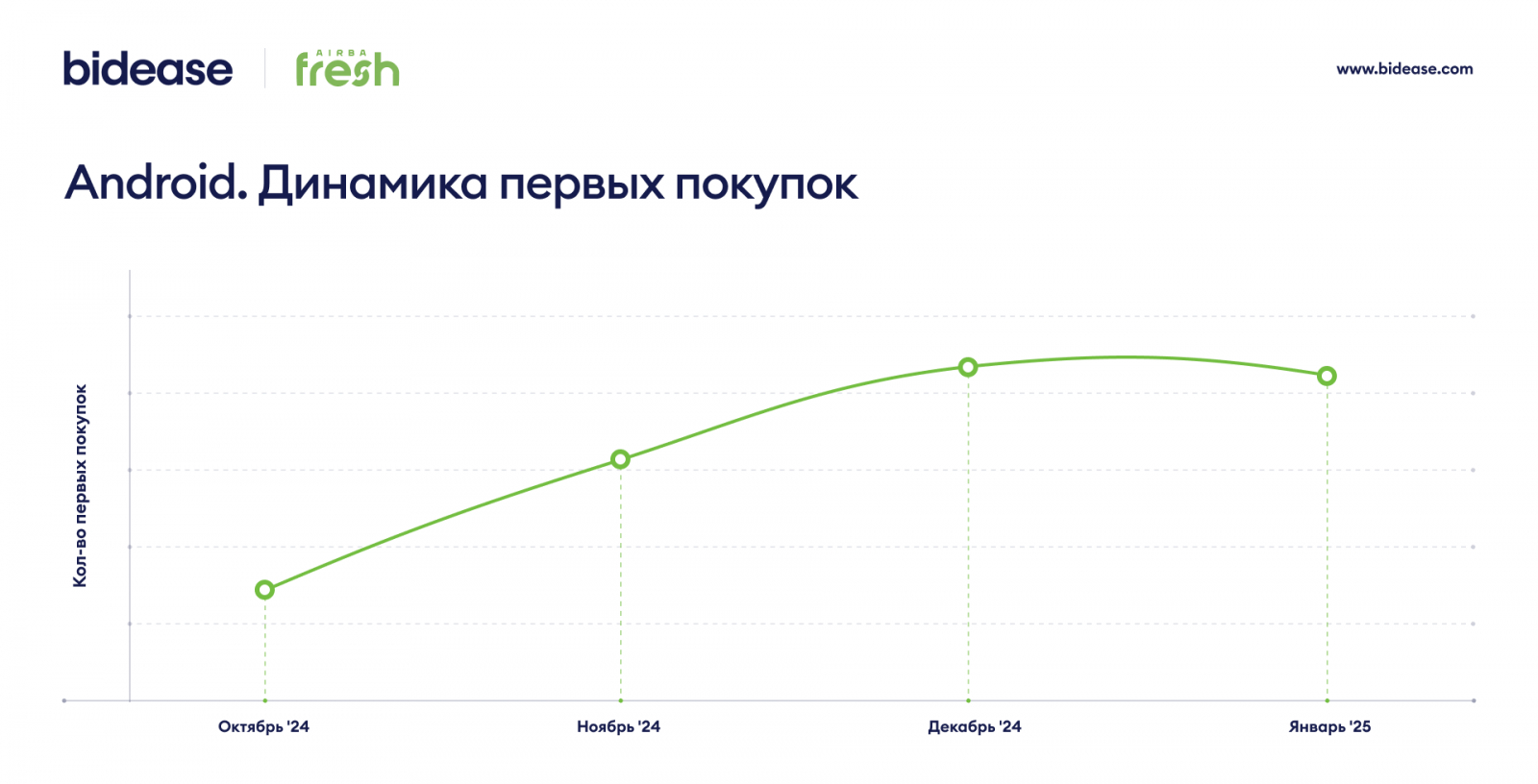 → в 5 раз увеличить количество первых покупок через приложение в сравнении октябрь 2024 — январь 2025. Это говорит о корректно выбранной стратегии и хороших ёмкости и потенциале источника;