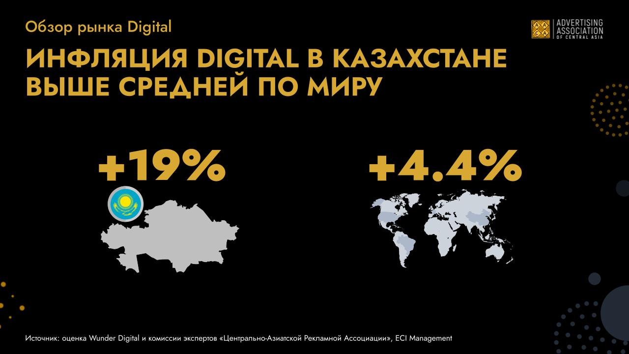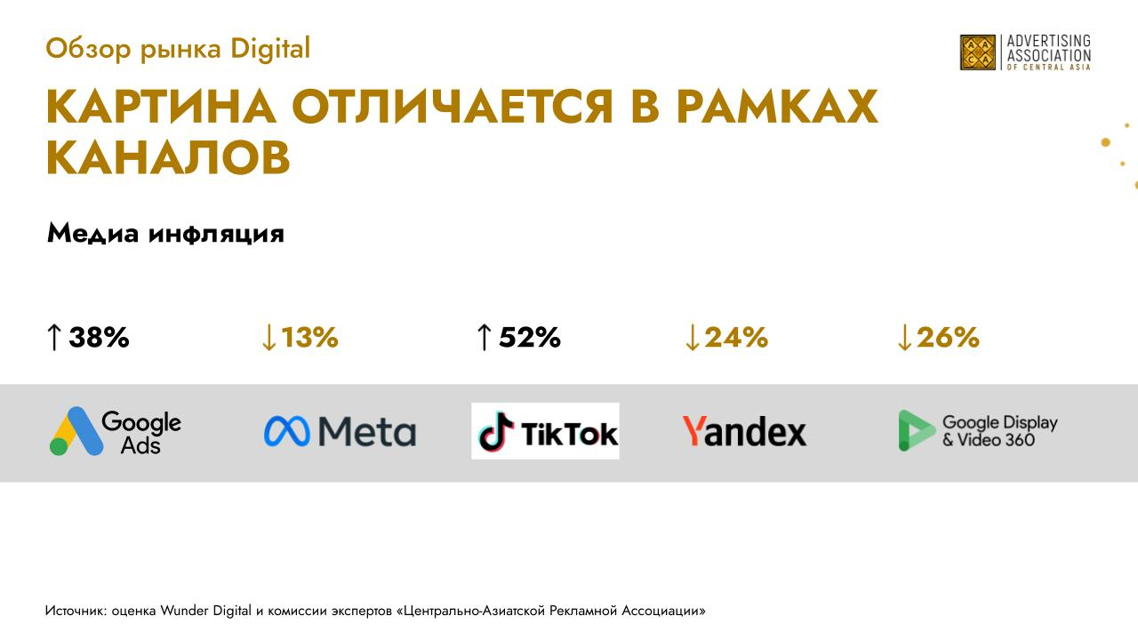 Действительно, стоимость привлечения растёт, а ёмкость рынка не расширяется такими же темпами. К тому же медиаинфляция в Казахстане одна из самых высоких в мире (согласно данным Wunder Digital и комиссии экспертов «Центрально-Азиатской Рекламной Ассоциации», ECI Management)