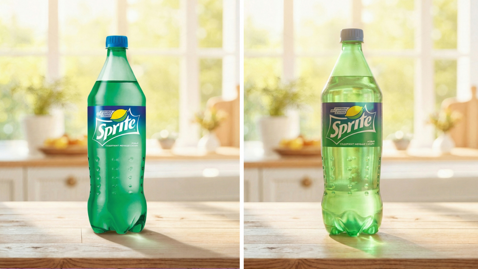 Промпт №2: use background from image 1, place sprite bottle from image 2 on wooden table, sunlight rays passing through bottle, translucent liquid, realistic light refraction, natural shadows, perfectly integrated lighting, photorealistic, high.