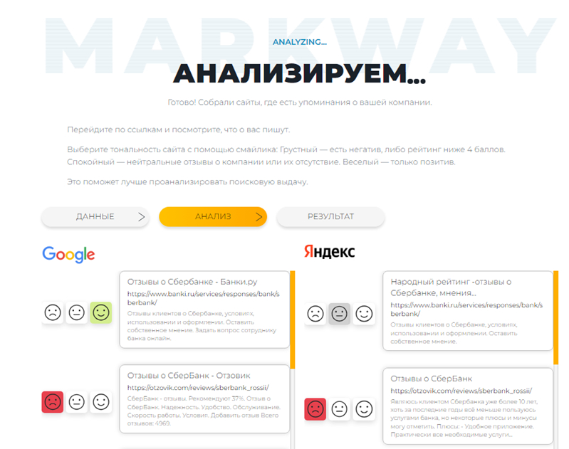 Затем система предлагает оценить результаты выдачи. Есть ли негативные отзывы о вас? Есть ли отзовики с рейтингом менее 4 баллов? Это показатель того, что репутация “заболела” и требует лечения. Система предложит вам оценить каждый сайт в топ-10 выдачи, разделив площадки на негативные, позитивные или нейтральные.
