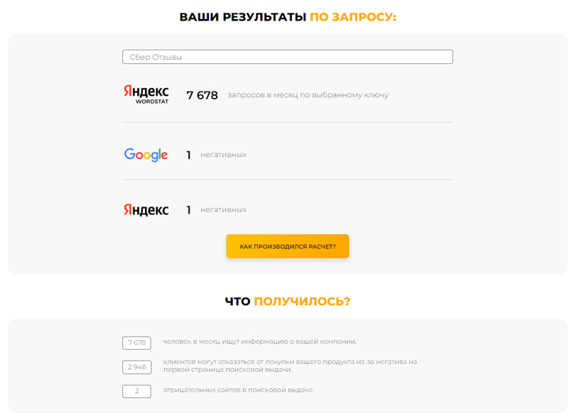 Так вы получаете нужный комплект данных: сколько людей ежемесячно ищут информацию о вашей компании и самое главное — сколько потенциальных клиентов могут отказаться от покупки из-за негативных отзывов.