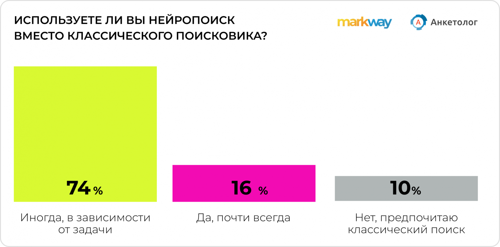 В сентябре сервис маркетинговых исследований Anketolog.ru и агентство Markway провели масштабное исследование, чтобы понять, как россияне взаимодействуют с нейропоиском. В опросе приняли участие 2 000 жителей городов-миллионников.